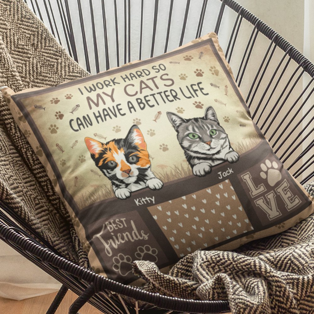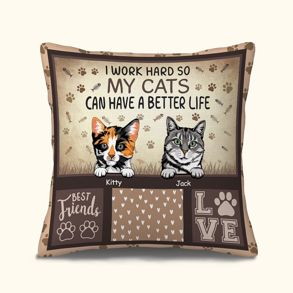 La funda de almohada imprime las palabras "I WORK HARD SO MY CATS CAN HAVE A BETTER LIFE" para expresar el amor por los gatos, y se puede personalizar con razas y nombres de gatos para formar una única para atraer a los amantes de los gatos que aman la decoración del hogar juguetona y caprichosa.