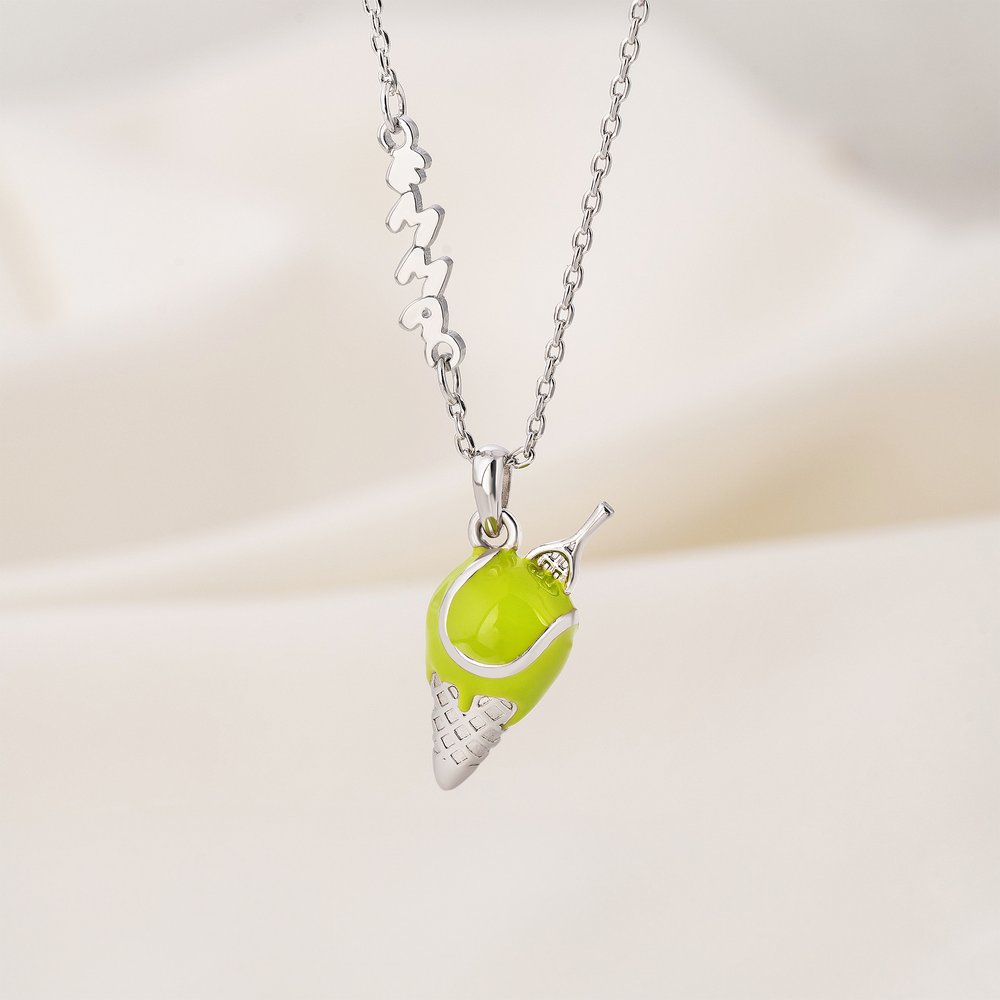 Este collar presenta una combinación de helado y pelotas de tenis, que simbolizan tanto la monada como el deporte. Es perfecto para los entusiastas del deporte como tú o tus familiares y amigos. Disponible en tres colores, puede personalizarse con un nombre en letra de burbuja, lo que lo convierte en un accesorio verdaderamente personal.