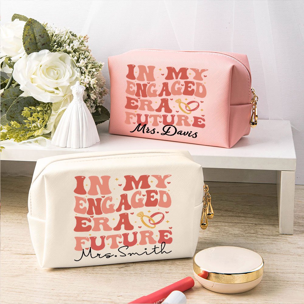 Las palabras "IN MY ENGAGED ERA FUTURE" en la parte delantera añaden emoción y alegría, capturando la esencia de este hermoso momento. También ofrecemos personalización con el nombre, así que tanto si lo usas en casa, en el trabajo o durante los preparativos de la boda, este neceser de maquillaje se convertirá en un recordatorio diario de tu próxima boda y su felicidad.