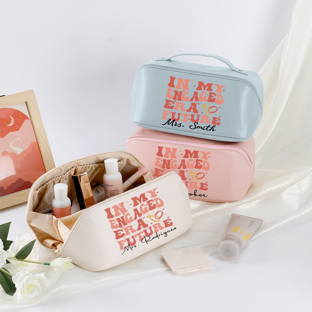 En este neceser de maquillaje se ha fijado el texto "In My Engaged Era Future" y el dibujo del anillo en forma de corazón simboliza el compromiso matrimonial. Esto sirve como una representación significativa de la palabra "Engaged", destacando el tema del romance y la promesa de matrimonio. Para que este neceser de maquillaje sea aún más personal, puedes personalizar tu nombre debajo del diseño, añadiendo un toque especial que lo hace únicamente tuyo.