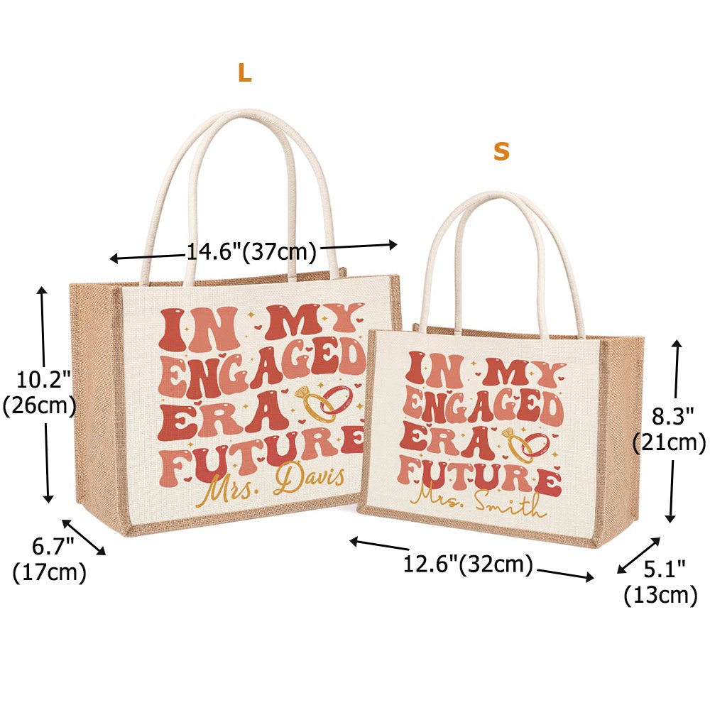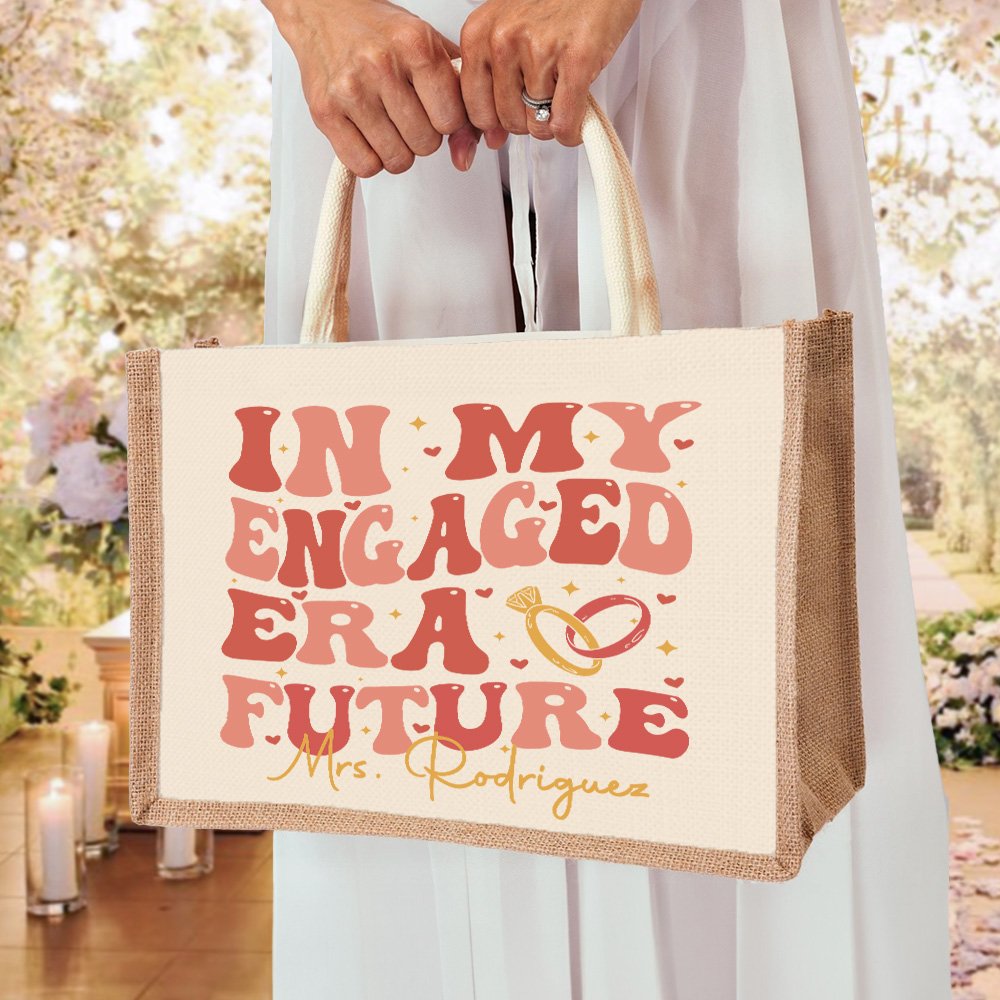 El diseño de esta bolsa de mano se inspira en el importante símbolo de la palabra "Engaged" (Comprometido), destacando el romanticismo del tema y la promesa del matrimonio. La bolsa lleva impreso "In My Engaged Era Future", anillos, corazones y otros elementos, que representan el compromiso de noviazgo. Puedes imprimir un título exclusivo en la bolsa para que este regalo tenga más significado y se convierta en un símbolo único en su vida diaria.