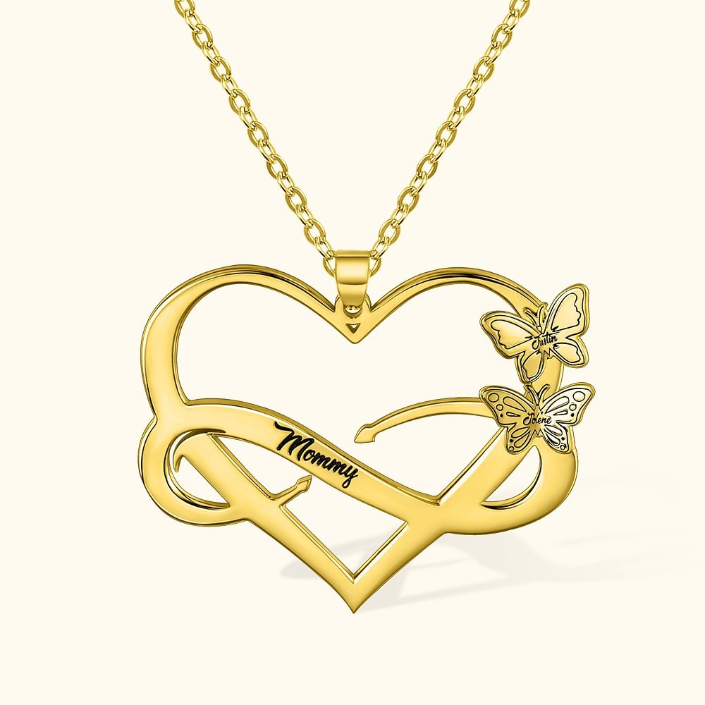 El signo del infinito significa eternidad y el corazón representa el amor. Este collar combina estos dos bellos significados y los nombres de las mariposas del mes de nacimiento para crear un símbolo de amor eterno entre los miembros de la familia. Un símbolo de infinito ocupa el centro del escenario dentro de un colgante de corazón. Puede llevar incrustaciones de 1 a 12 mariposas. Use este collar solo para una elegancia discreta o en capas con otros collares para un look audaz y contemporáneo.