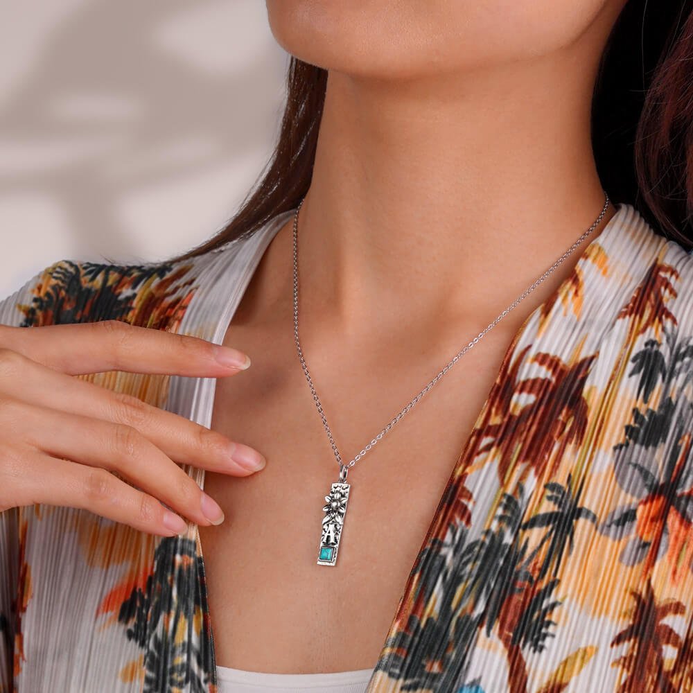 El collar presenta una exquisita mezcla de encanto bohemio y elegancia. Adornado con impresionantes piedras de turquesa y delicadas flores, puedes personalizarlo con una letra especial. Este detalle transforma el collar en una pieza única de joyería con valor sentimental, que se convertirá en un preciado recuerdo para quien lo lleve.