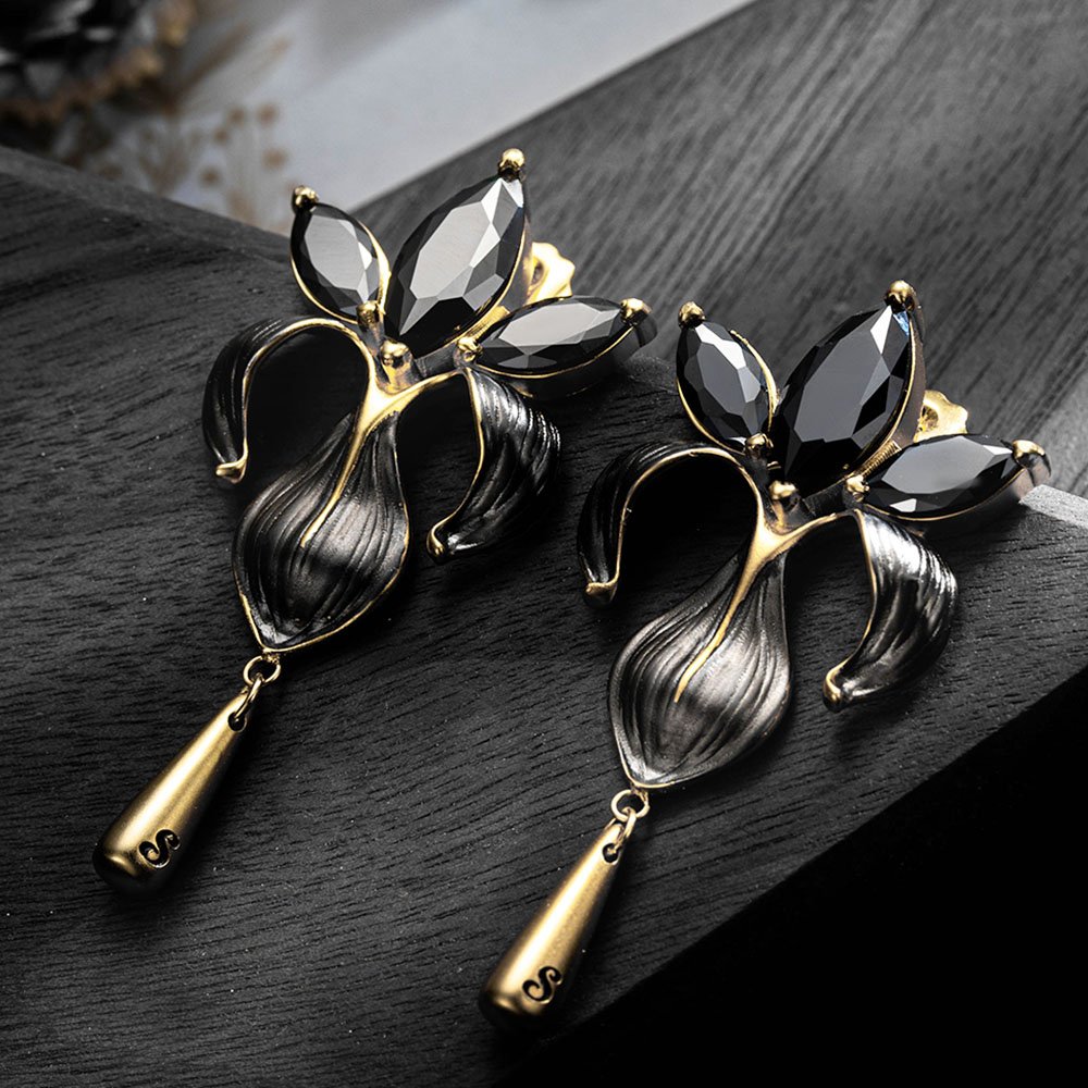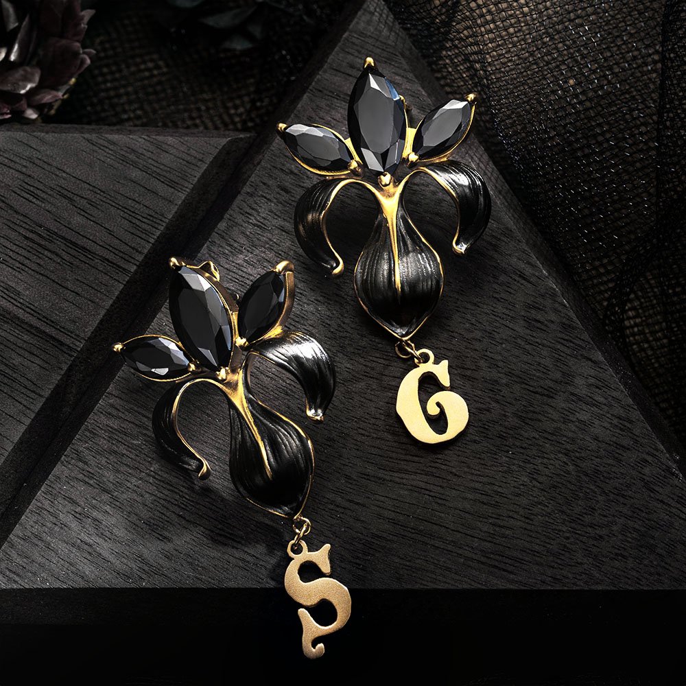 El iris representa la elegancia, la sabiduría, la independencia, la santidad, la admiración, el misterio y la rebeldía de la mujer. Se combina con circonitas negras para reflejar su exquisitez. El colgante de metal que cuelga aumenta la agilidad de los pendientes, las iniciales se pueden personalizar para mostrar la individualidad.