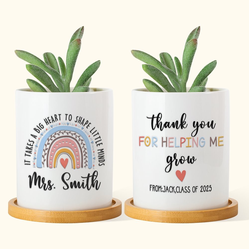 Esta maceta de cerámica con forma de arco iris es un regalo especial lleno de cálidas bendiciones. La maceta lleva frases como "Gracias por ayudarme a crecer" y "Se necesita un gran corazón para formar pequeñas mentes". Ya sea para una profesora, una madre o una abuela, puede reflejar tus profundas bendiciones y tu cariño. El cálido estampado de arco iris reconforta y alegra a quien lo recibe.