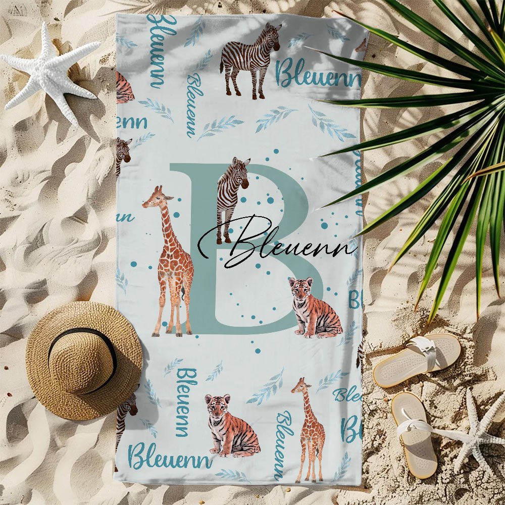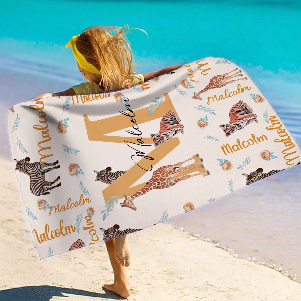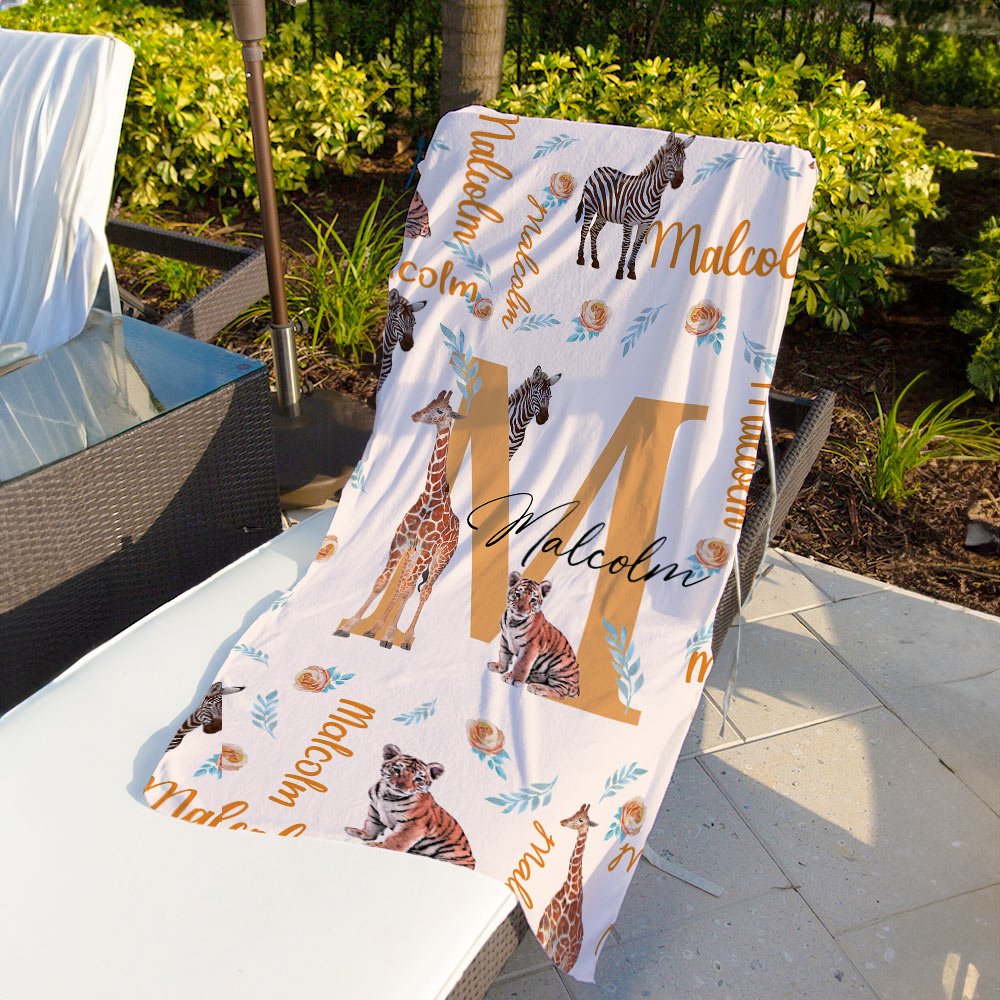 Esta toalla de playa está diseñada con elementos de animales de la jungla, incluyendo estampados como cebra, jirafa, tigre, etc., llenos de estilo aventurero. Puedes añadirle tu nombre, reconoceremos automáticamente las iniciales y repetiremos tu nombre en diferentes fuentes para crear un efecto artístico único, lleno de capas y diversión.