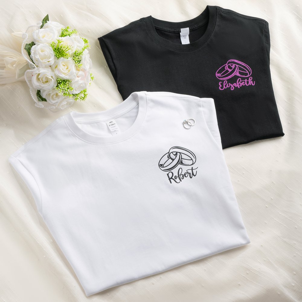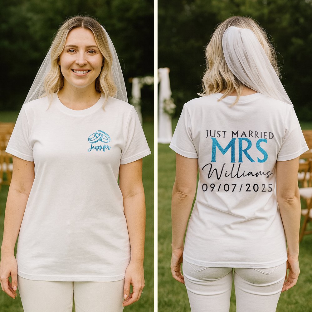 Personalizada Just Married Mrs Mr Multicolor 100% Algodón Camiseta con Nombre Boda Bridal Shower Luna de Miel Regalo para Novia Novio Pareja