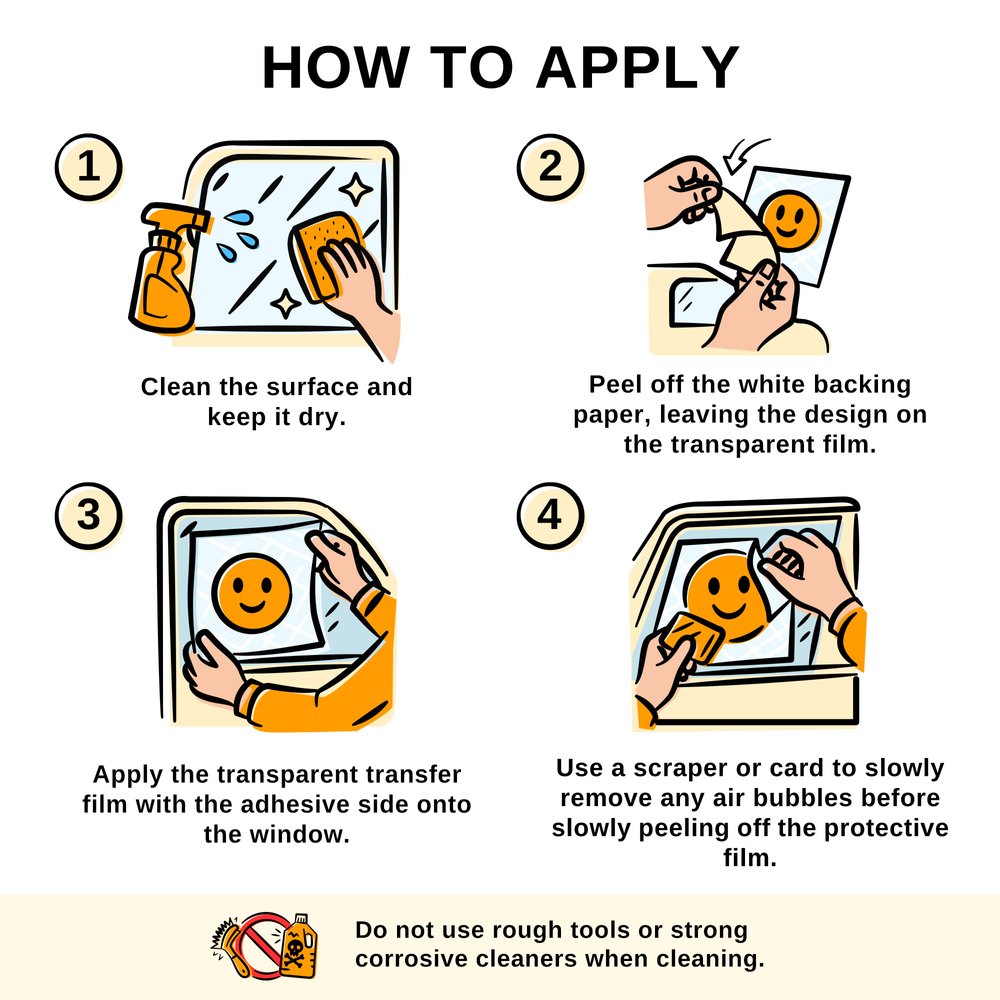1. Limpie la superficie y manténgala seca. Evite usar herramientas ásperas o limpiadores corrosivos fuertes al limpiar. 2. Despegue el papel de soporte blanco, dejando el diseño en la lámina transparente. 3. Aplique la película transparente de transferencia con la cara adhesiva sobre la ventana. 4. 4. Utilice un rascador o una tarjeta para eliminar lentamente las burbujas de aire antes de despegar lentamente la película protectora.