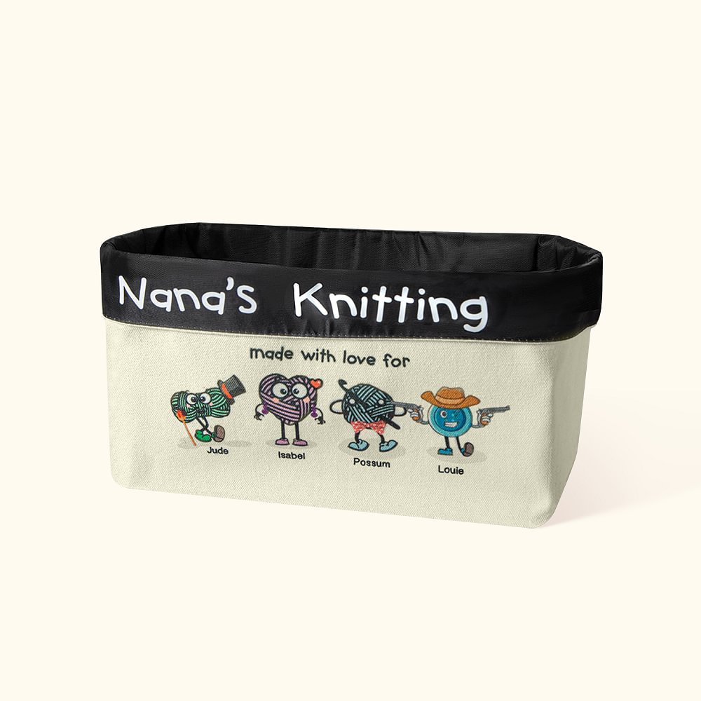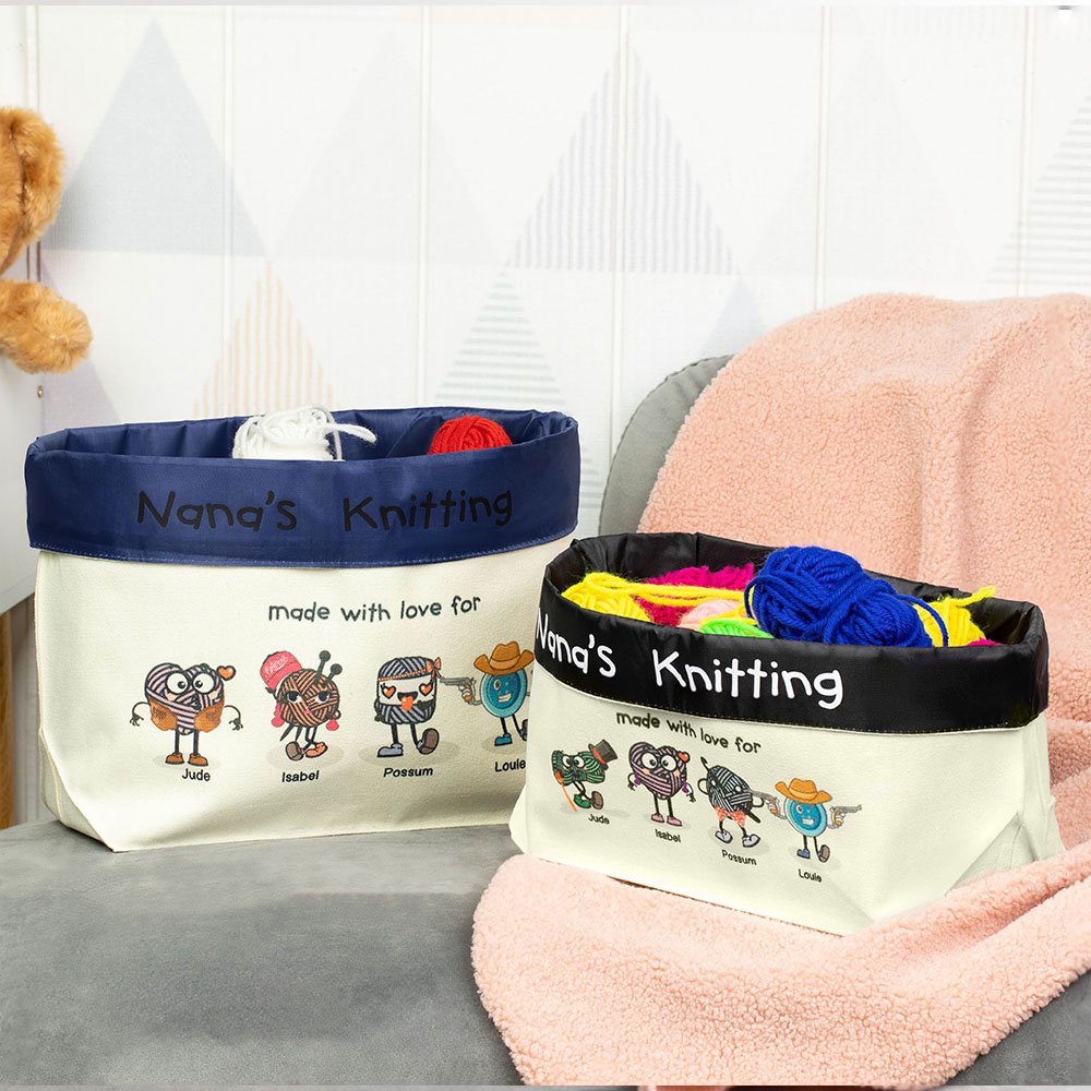 El organizador de lona de punto es imprescindible para cualquier costurera. Excelente almacenamiento para sus herramientas de costura y ovillos de hilo. Usted puede mantener su lana y el hilo en un solo lugar, o simplemente organizar sus proyectos de artesanía actuales. La caja de almacenamiento puede contener alrededor de 5 o 6 ovillos de lana, puede elegir 2 tamaños y colores, es el regalo perfecto para cualquier amante de tejer. Puede según los miembros de su familia y sus personajes y nombres exclusivos. Los animados y adorables diseños de los personajes llaman la atención.