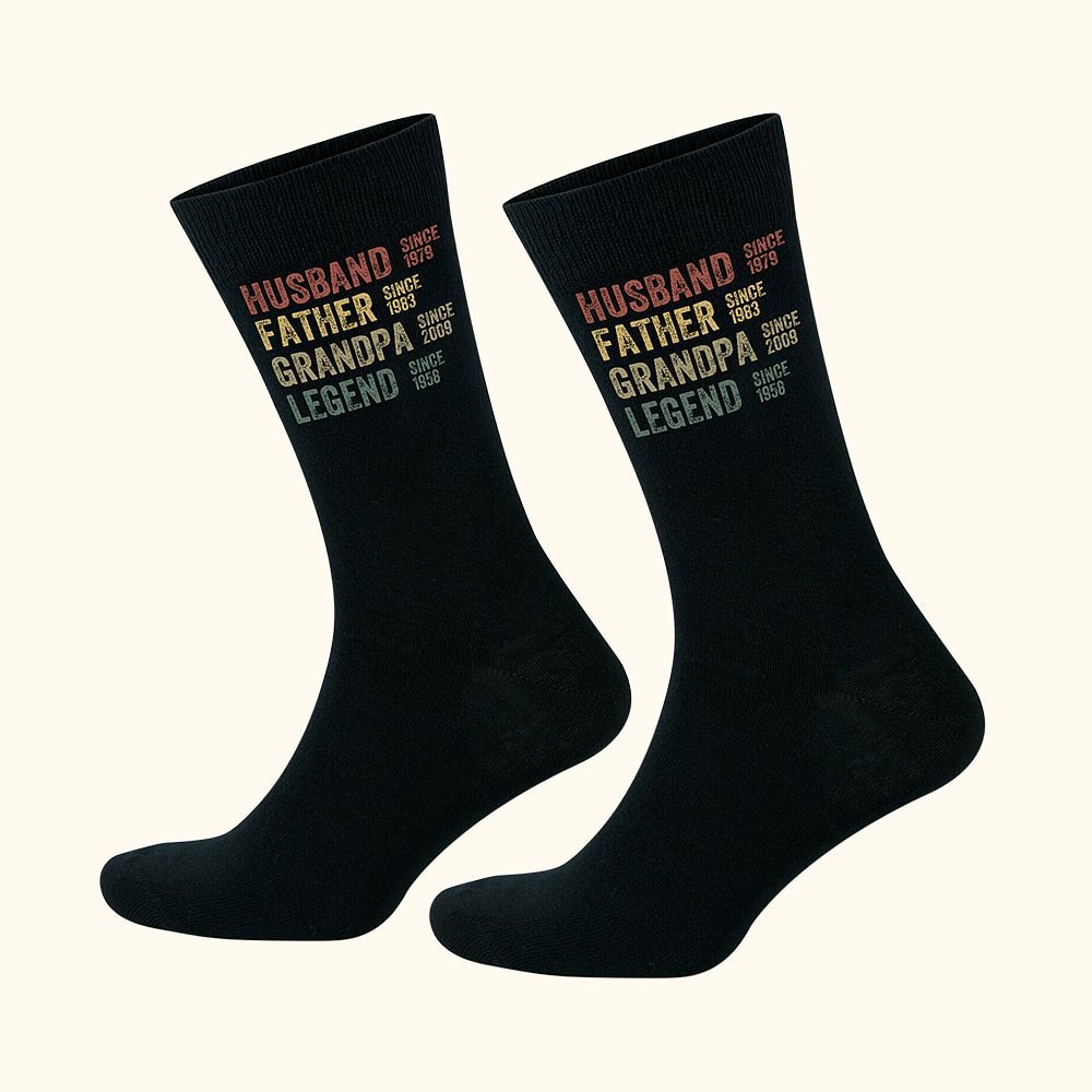 Este par único de calcetines personalizados "leyenda" es una forma divertida de mostrar tu amor y aprecio a tu familia como tu padre, marido o abuelo. El texto personalizado fue diseñado no sólo para rendir homenaje al hombre sino también para tener sentido del humor.