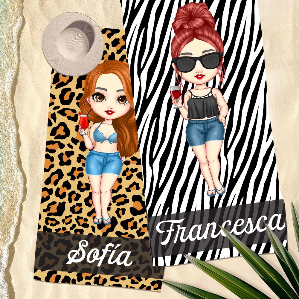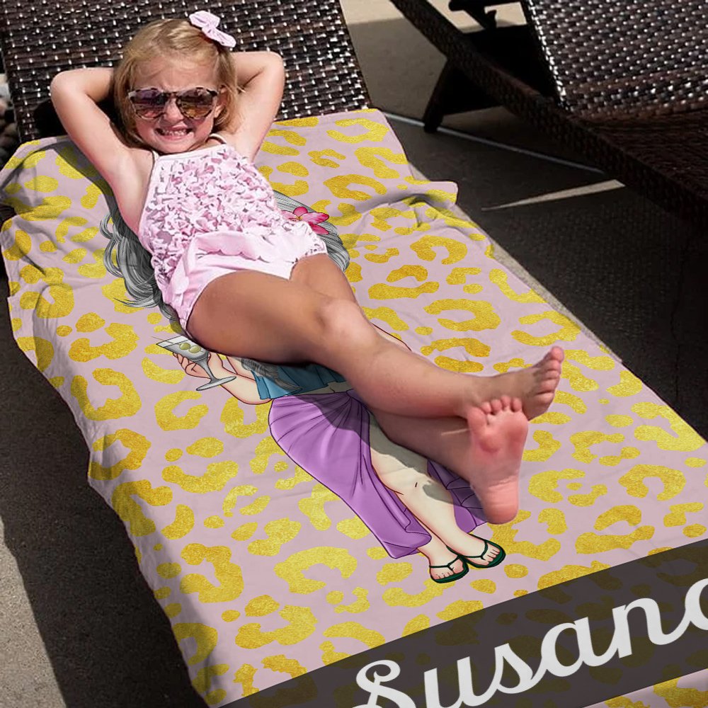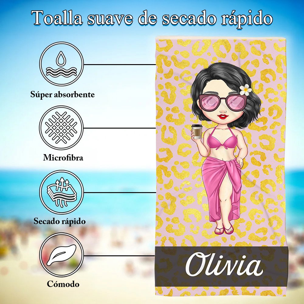El diseño de esta toalla de playa es vibrante y llamativo. Cuenta con disfraces de personajes de estilo vacaciones de playa, con fondos de estampado de leopardo y cebra. También puedes personalizarla con tu nombre. Las combinaciones juguetonas de colores y patrones añaden un toque divertido y estiloso a tu viaje a la playa.