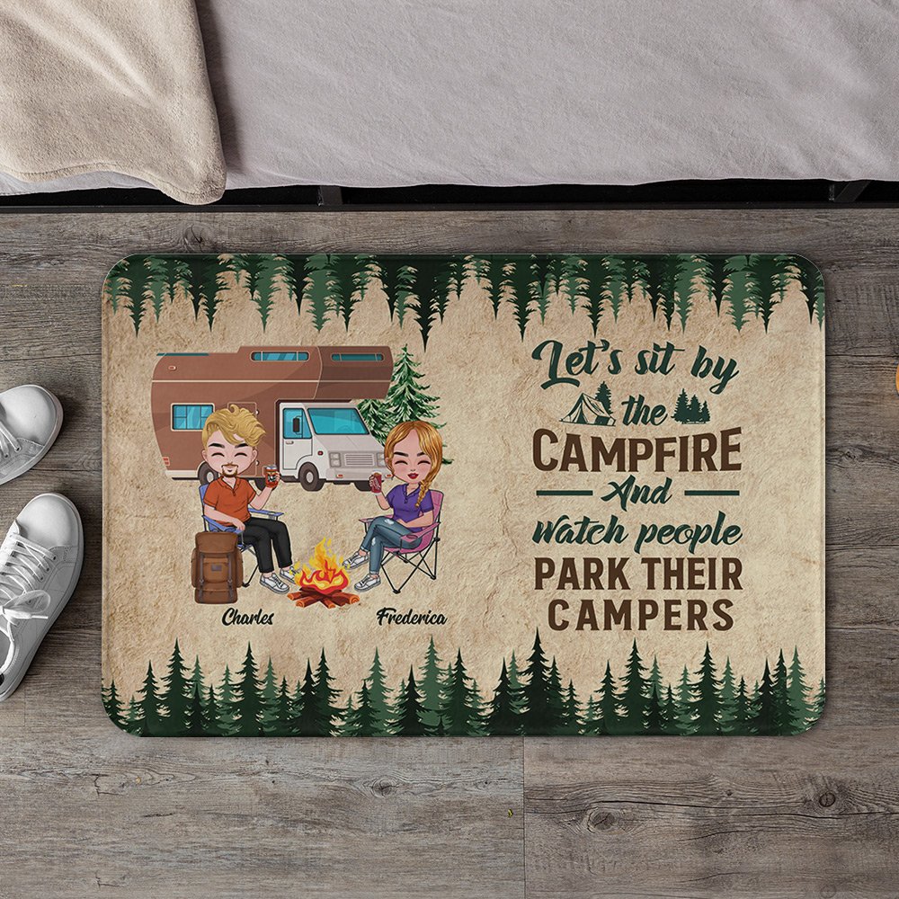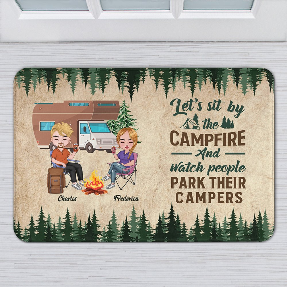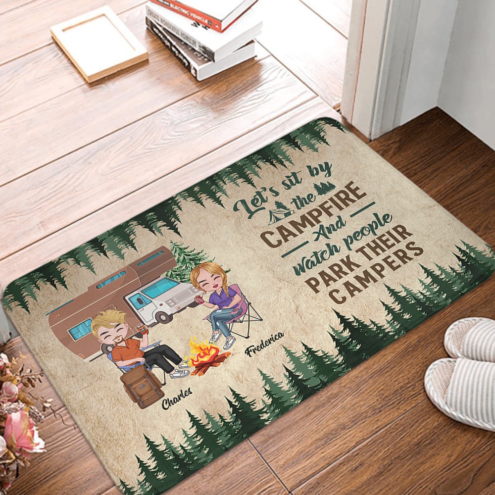 El mensaje "Sentémonos junto a la hoguera y veamos a la gente aparcar sus caravanas" está bellamente impreso en el felpudo, recordando a la pareja su amor eterno y las aventuras que han compartido.