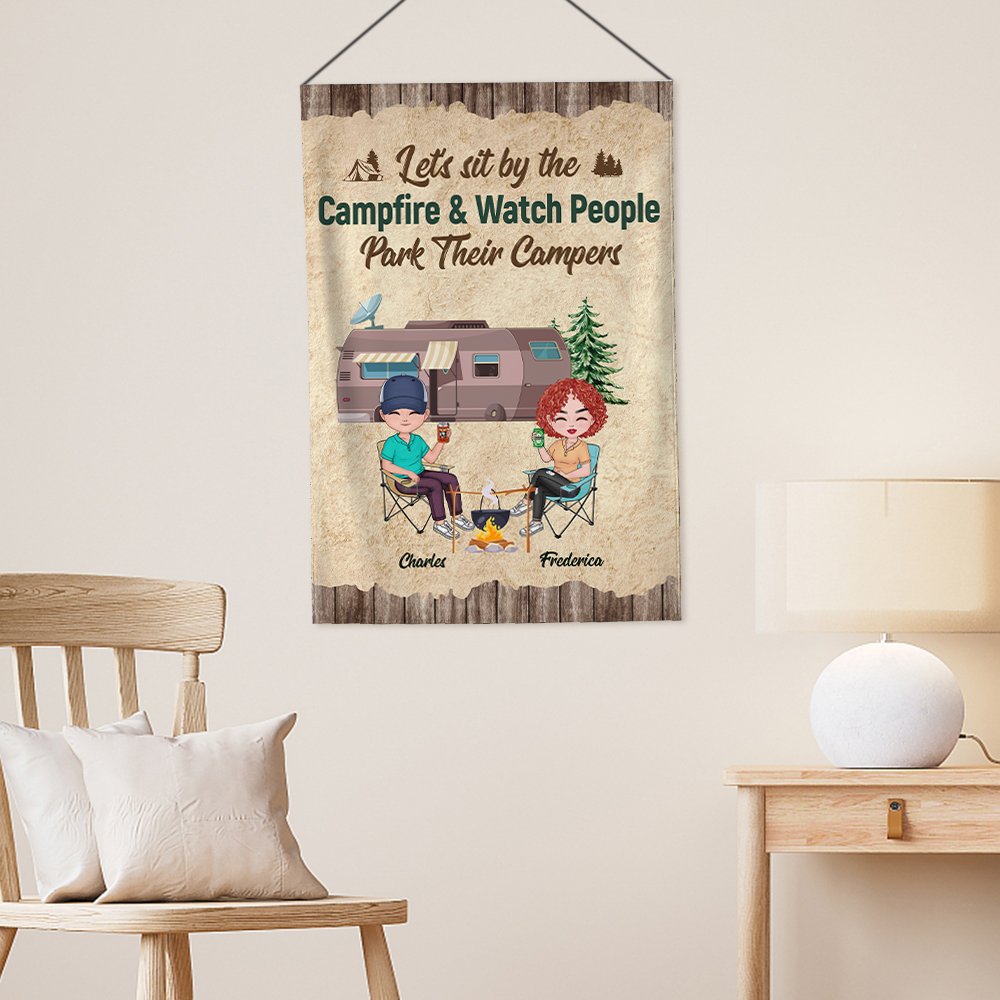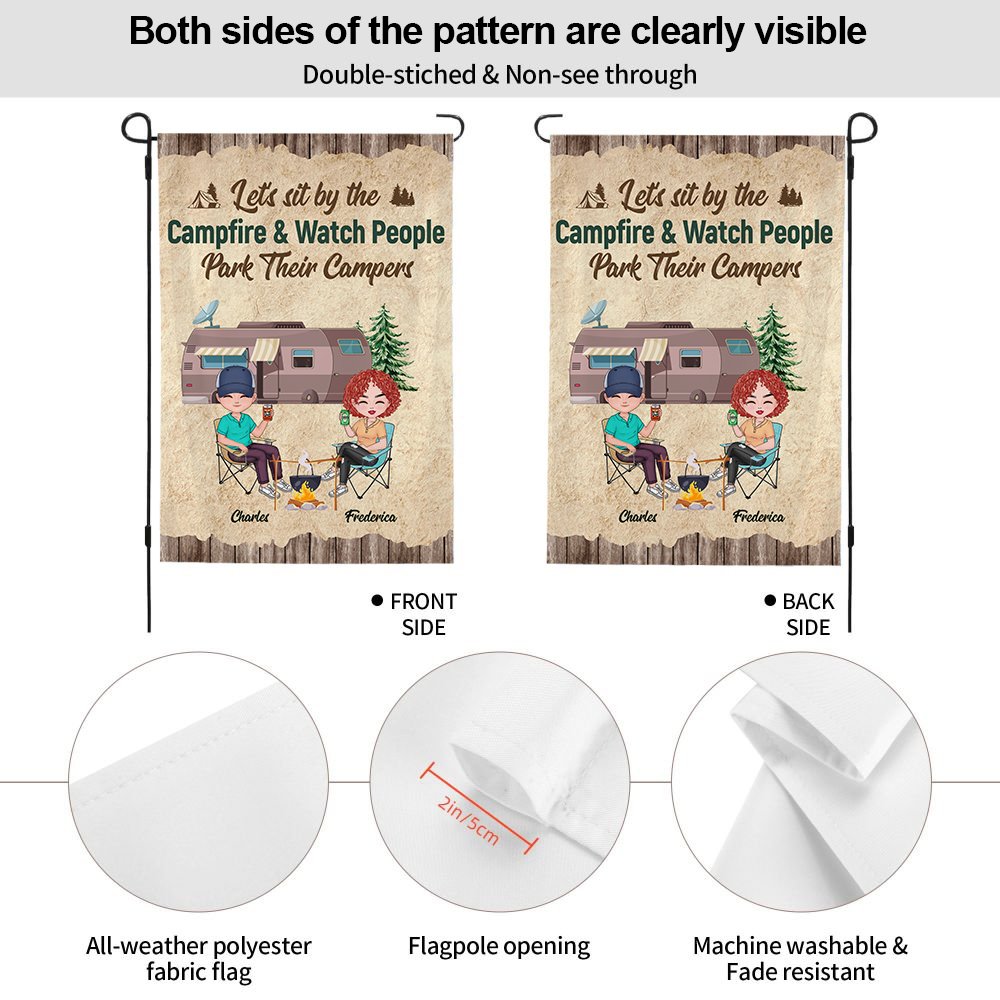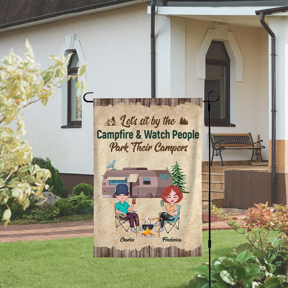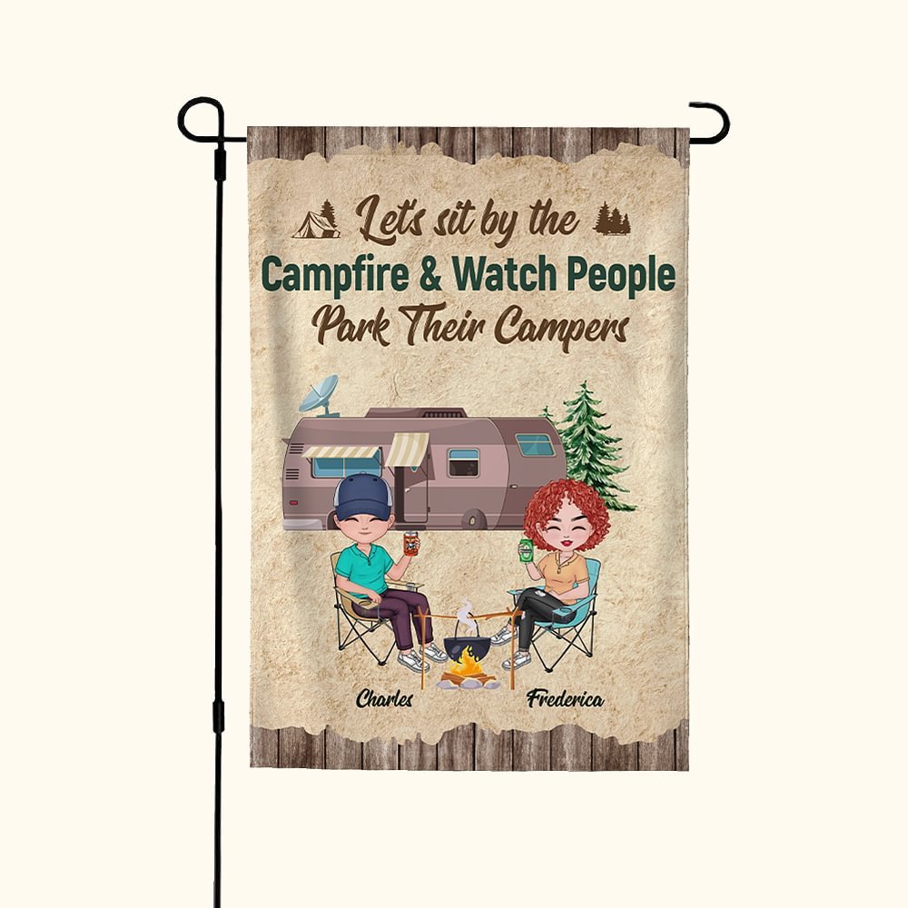 Personalizada Let's Sit by the Campfire and Watch People Park Their Campers Bandera de jardín Regalo de aniversario para parejas de camping