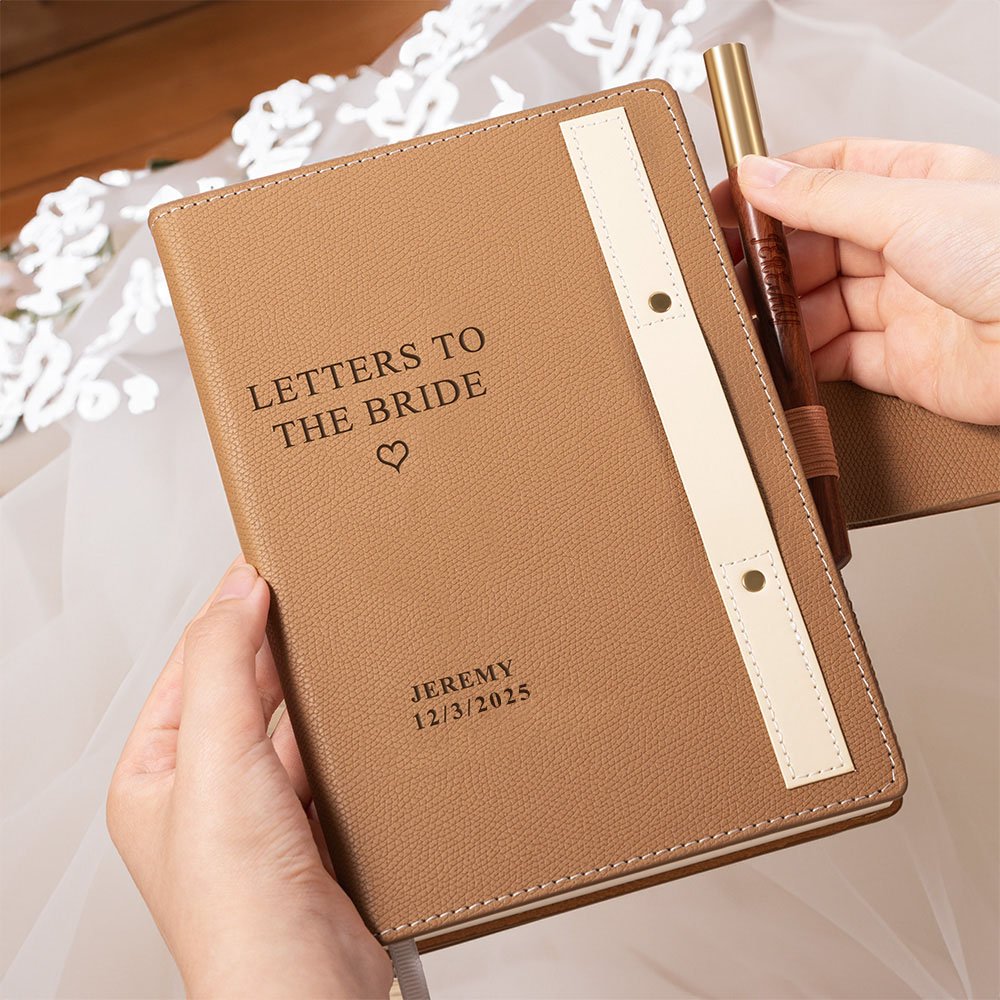 Este exquisito cuaderno A5 de piel con rayas es una opción de regalo excepcional para novias. Su función personalizada permite grabar el nombre de la novia y fechas significativas, como el día de su boda u otros aniversarios memorables, convirtiéndolo en un recuerdo único. Está disponible en cuatro opciones de color para adaptarse a diferentes personalidades y preferencias. Además, el cuaderno viene con un bonito bolígrafo negro de madera para firmas, que también puede personalizarse con el nombre.