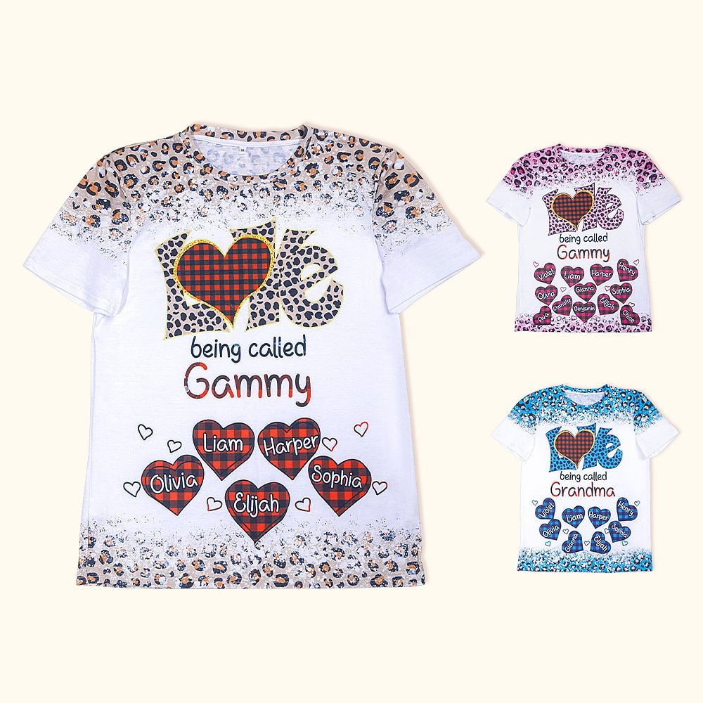 Camiseta personalizada Love Being Called Grandma Leopard Plaid Heart Design con el nombre de 1 a 12 niños Regalo del Día de la Madre para la abuela mamá