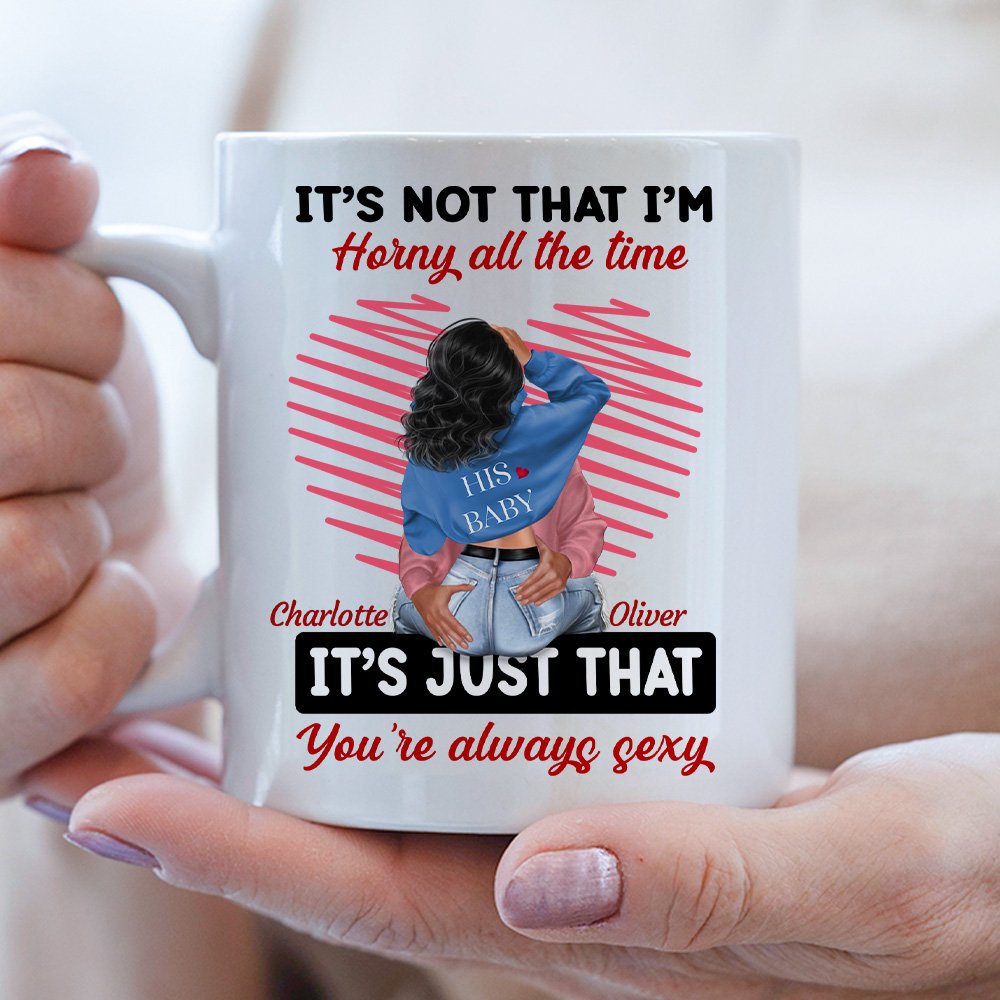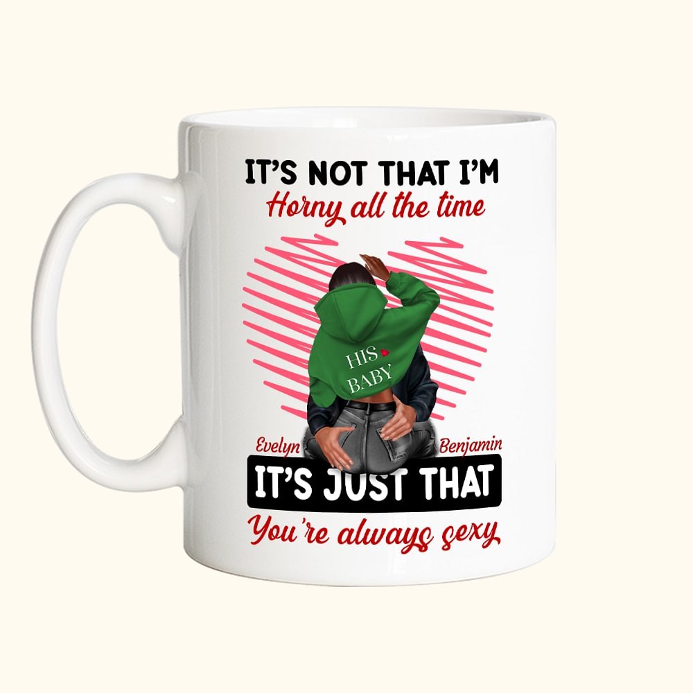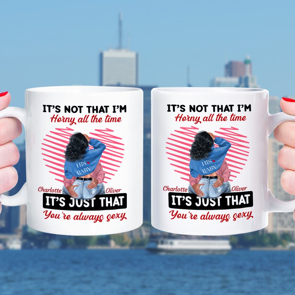 Esta taza se puede personalizar con el nombre de su amante. Además, puede personalizar la imagen de dibujos animados de usted y su amante. El mensaje "It's Not That I'm Horny All The Time, It's Just That You're Always Sexy" está impreso en la taza, por lo que es un recuerdo perfecto para conmemorar su compañerismo y amor, y merece ser apreciado.