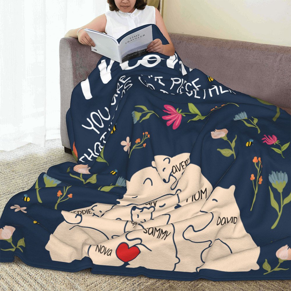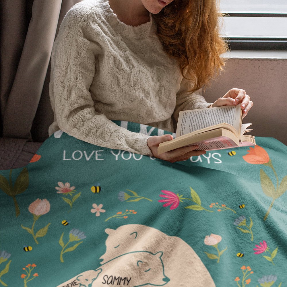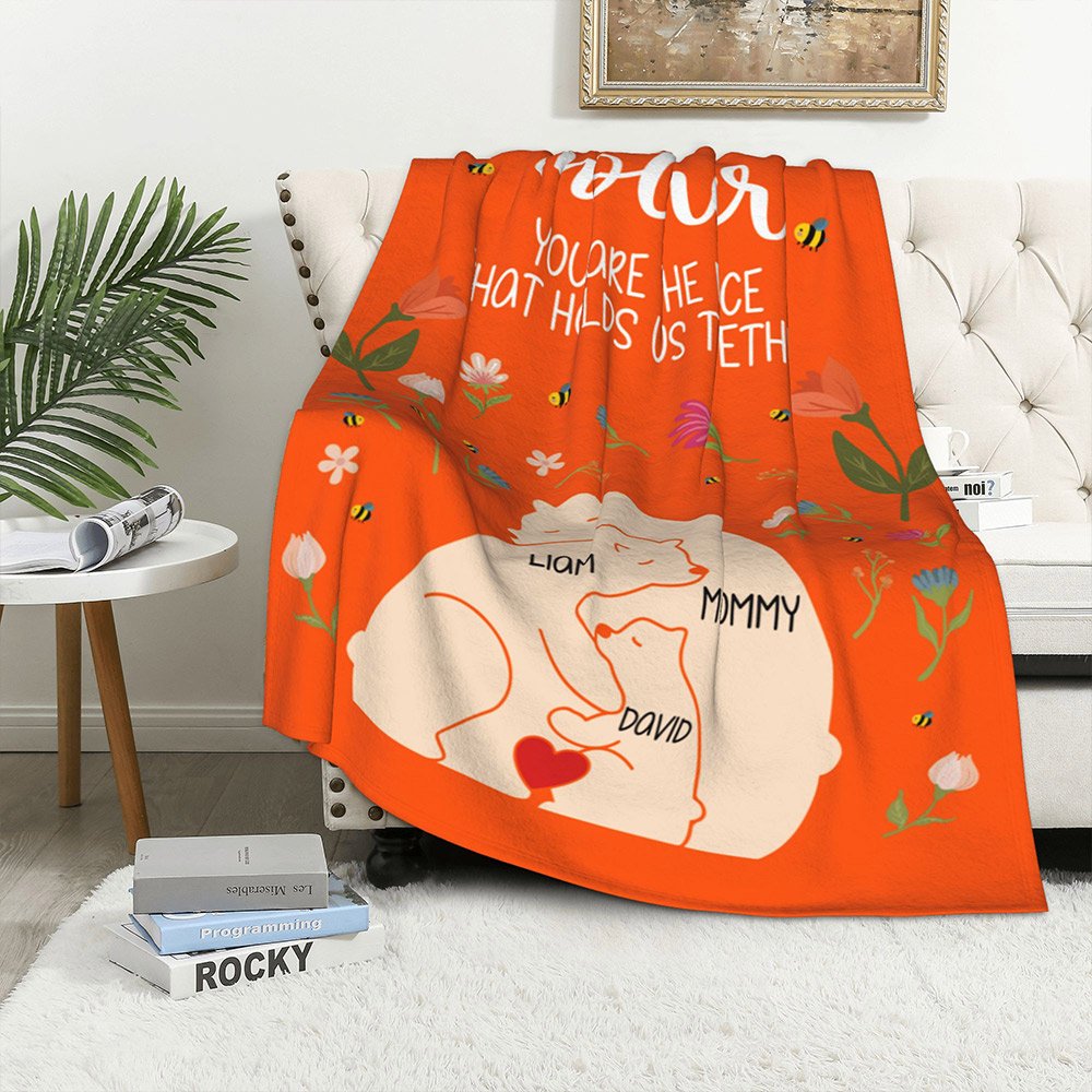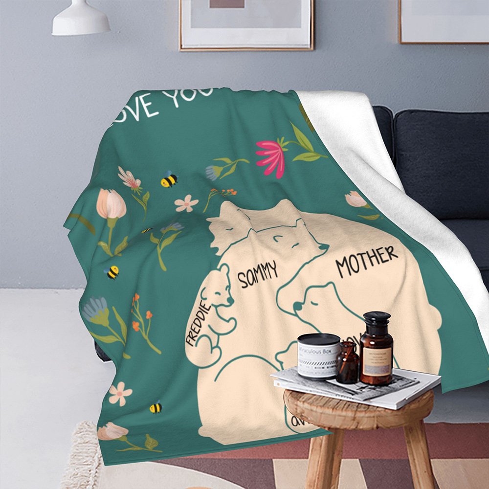 El dibujo de esta manta es un nido de osos abrazados, rodeados de flores y abejas, que simbolizan una familia amorosa. Puedes personalizar de 2 a 9 osos, cada uno con su nombre correspondiente, para recordar que el amor y el apoyo mantienen unida a tu familia en los buenos y en los malos momentos.