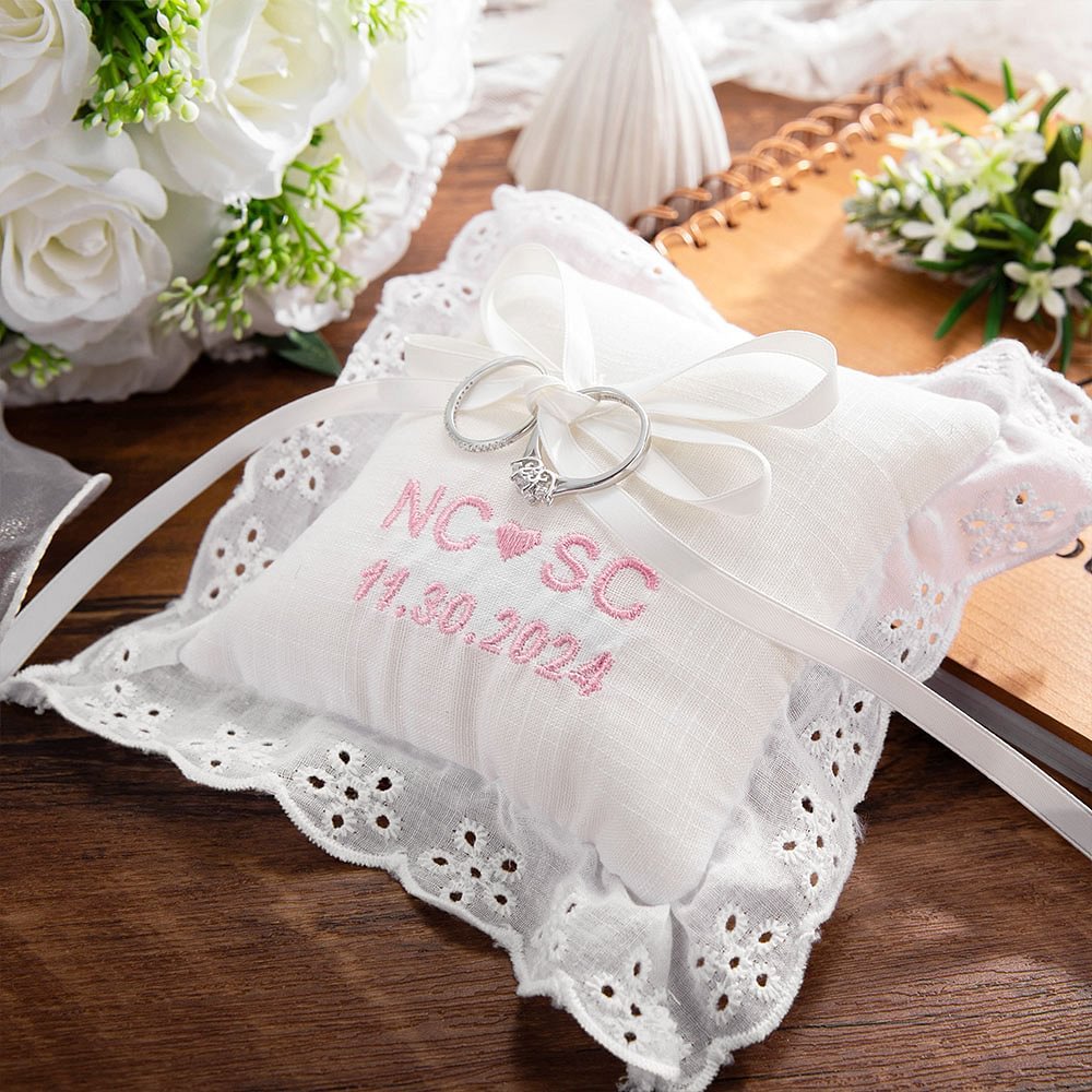 Este cojín para anillos está hecho de lino de algodón de primera calidad. La bonita cinta permite atar los anillos y mantenerlos a buen recaudo. Los bordes festoneados ofrecen un tacto suave y lujoso que complementa la elegancia del día de su boda.