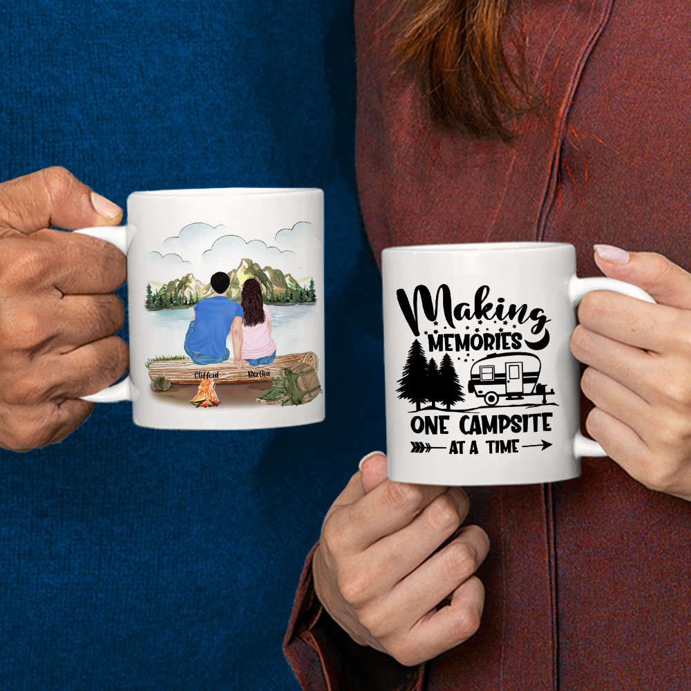 Taza de cerámica personalizada Making Memories One Campsite at a Time Mountain View White Taza para viaje de camping familiar Regalo para amigo de la