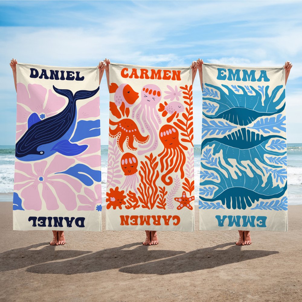 Elige patrones como animales marinos (peces, medusas), conchas, plantas o escenas del mar. Añade un nombre con 5 opciones de colores (color coral, azul océano, etc.). Crea una “toalla de aventura oceánica” única: destaca con un estilo exclusivo y aporta una personalización artística a tus salidas de verano.