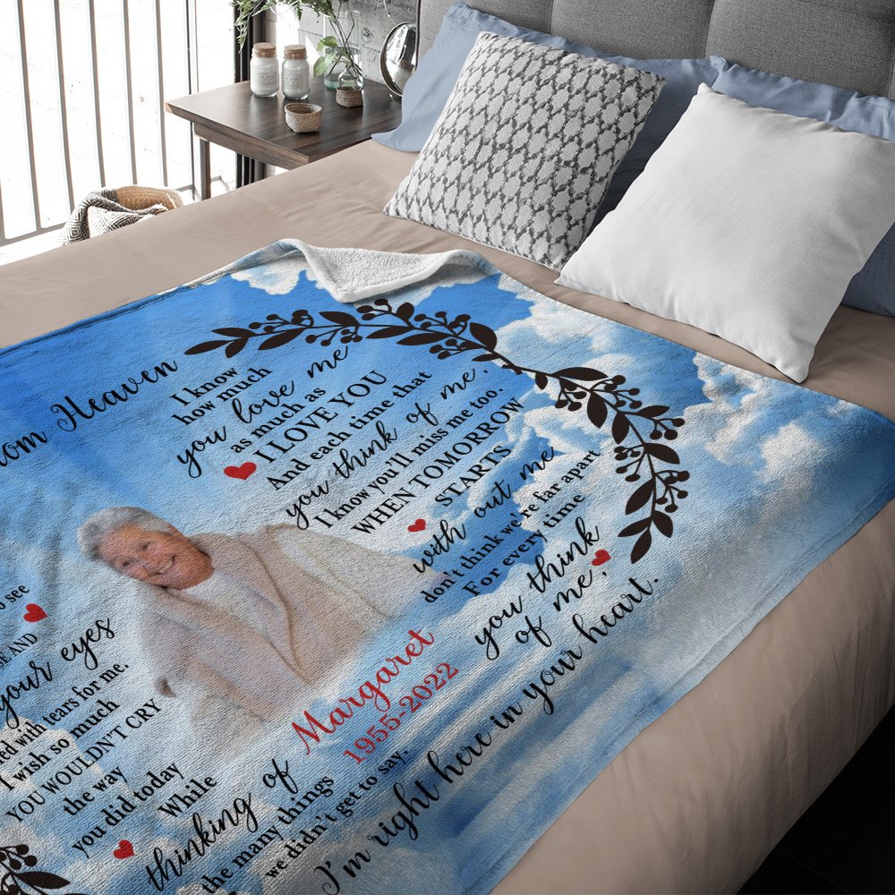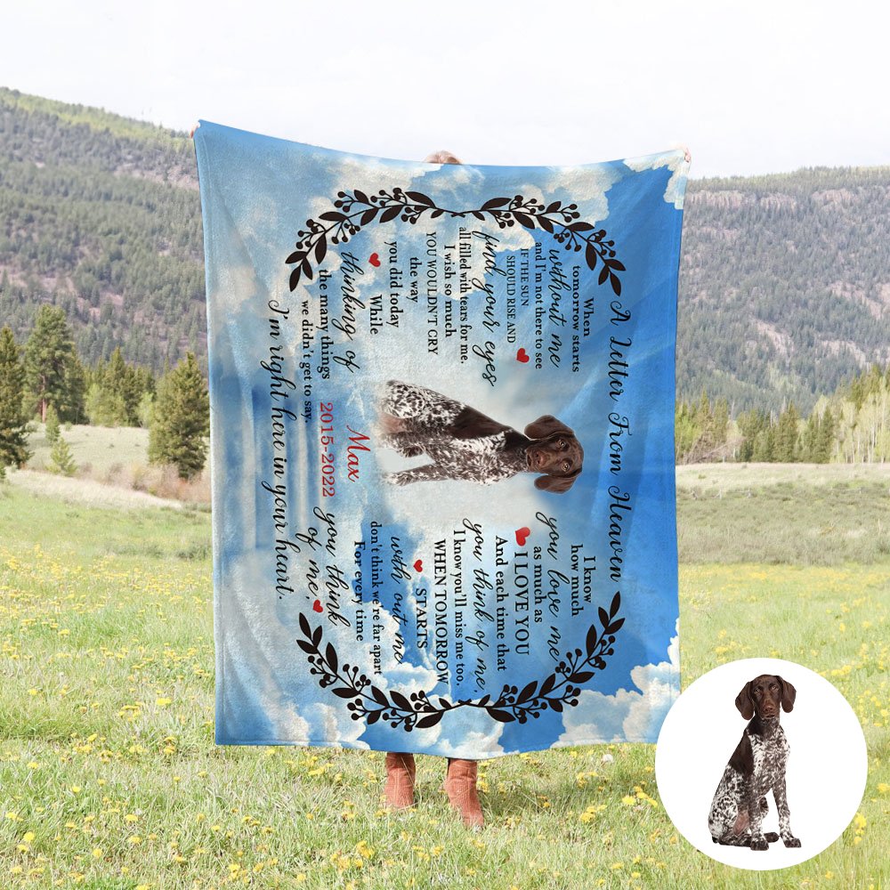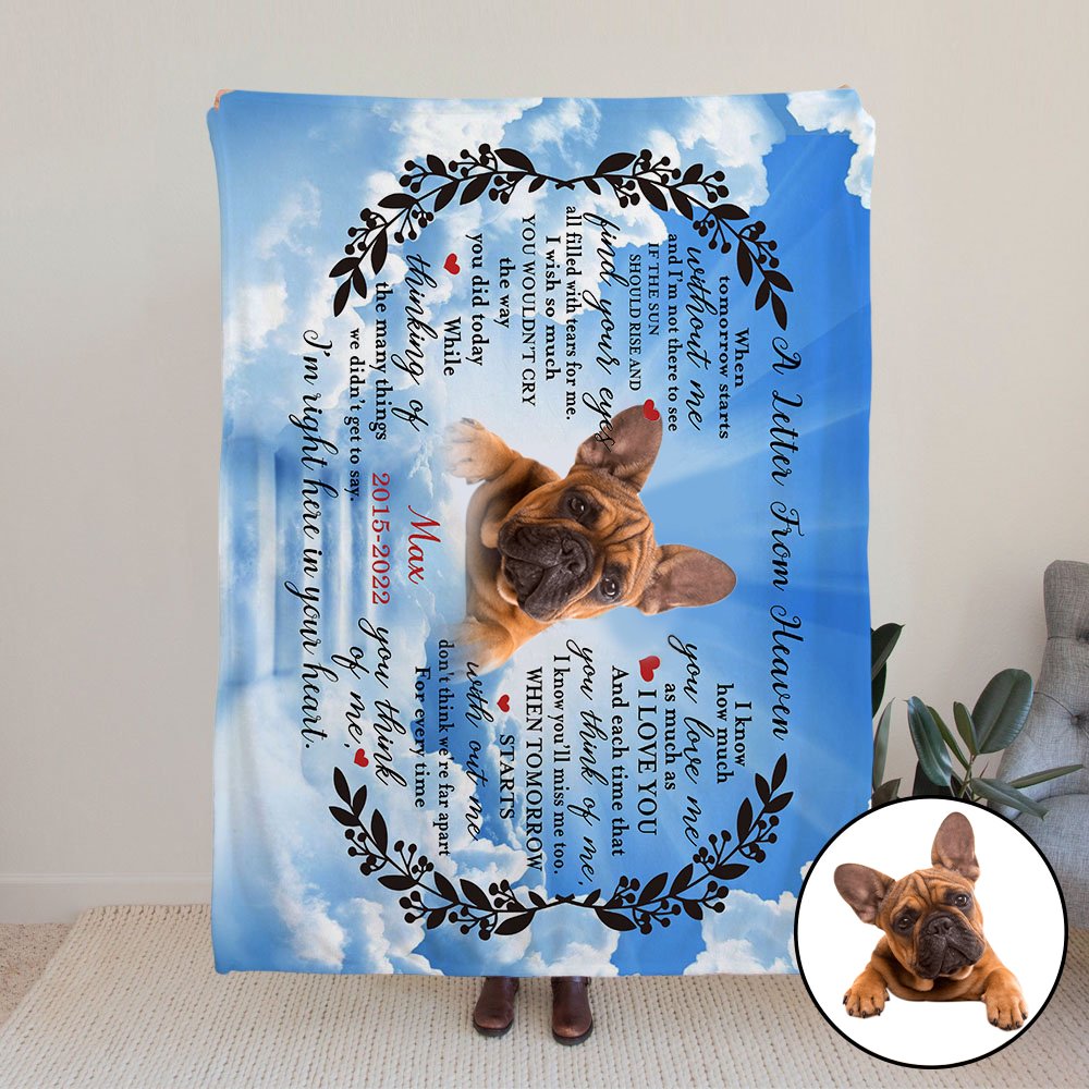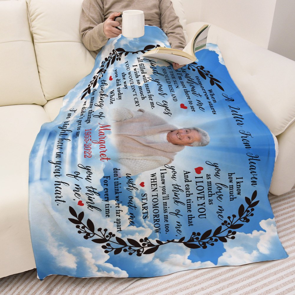 Como puede ver en las imágenes, nuestra manta conmemorativa está diseñada con "Una carta del cielo"; Por lo tanto, puede cargar una foto de medio cuerpo de su ser querido o mascota para hacer sus manualidades personales de bricolaje.