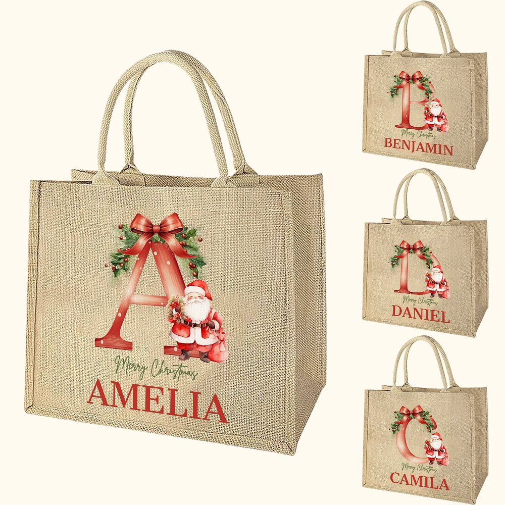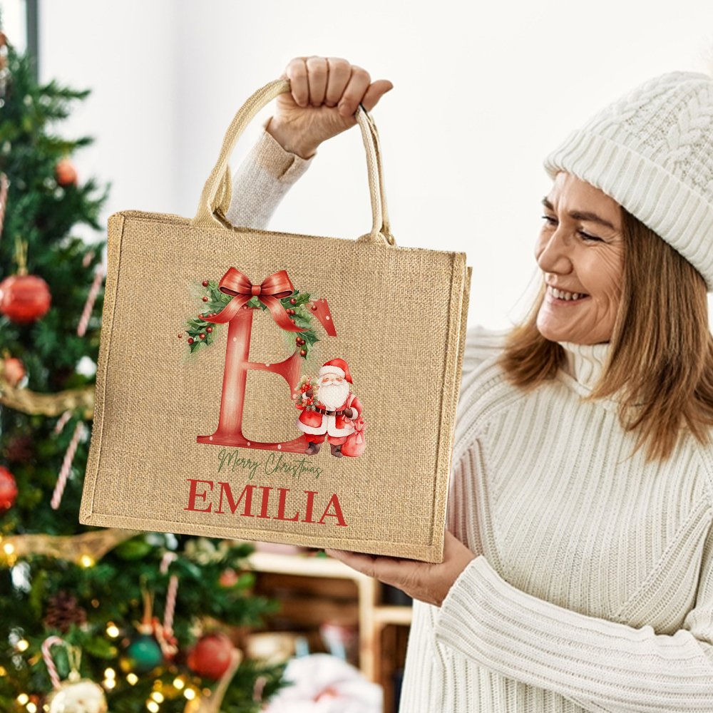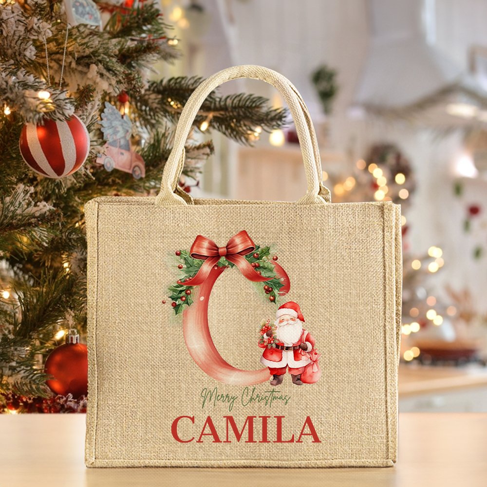 Prepárate para repartir alegría navideña con nuestra preciosa bolsa de yute. Esta bolsa tiene hojas de acebo, lazos, Papá Noel y mucho más en un festivo tono rojo que captura la esencia de la Navidad. La parte inferior tiene un mensaje fijo de "Feliz Navidad"; puedes personalizar tu nombre para que esta bolsa sea más personal.