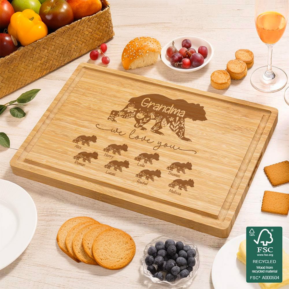 Esta tabla de cortar presenta un conmovedor grabado de "Mamá osa y bebé oso", que simboliza el amor desinteresado de la madre y el cuidado de su hijo; mientras que el texto fijo "Te queremos" expresa la gratitud del niño por los esfuerzos de la madre. Además, puede añadir un título y los nombres de 1 a 12 niños para hacer este regalo más exclusivo, y dejar que la madre o la abuela sientan el profundo amor de la familia cada vez que lo usen.
