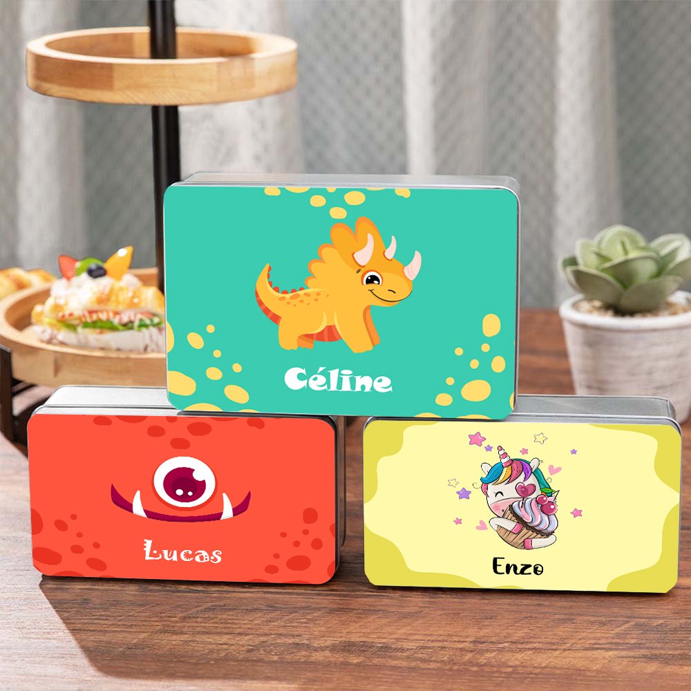 Caja de metal para galletas con nombre personalizada Monster Fantasy Unicorn Dinosaur Food Grade Metal Biscuit Tin Box with Name Children's Day Birthday Gift for Kids Family