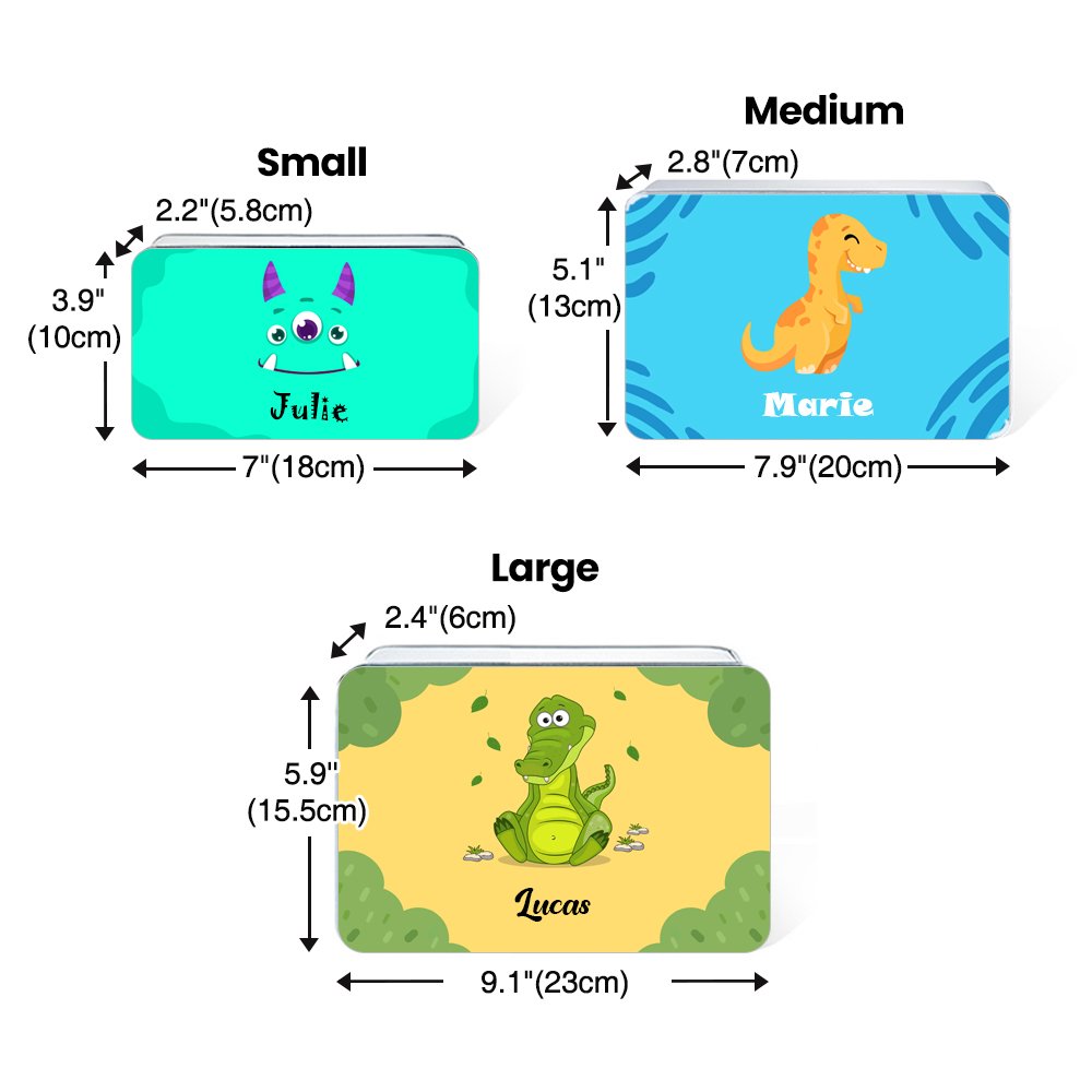Esta caja de galletas de hojalata está disponible en 3 tamaños y puede personalizarse con diversos dibujos de animales de dibujos animados, como monstruos, dinosaurios, unicornios fantásticos y animales de la serie del bosque. Puede satisfacer los intereses de diferentes niños. Se convertirá en un regalo conmemorativo.
