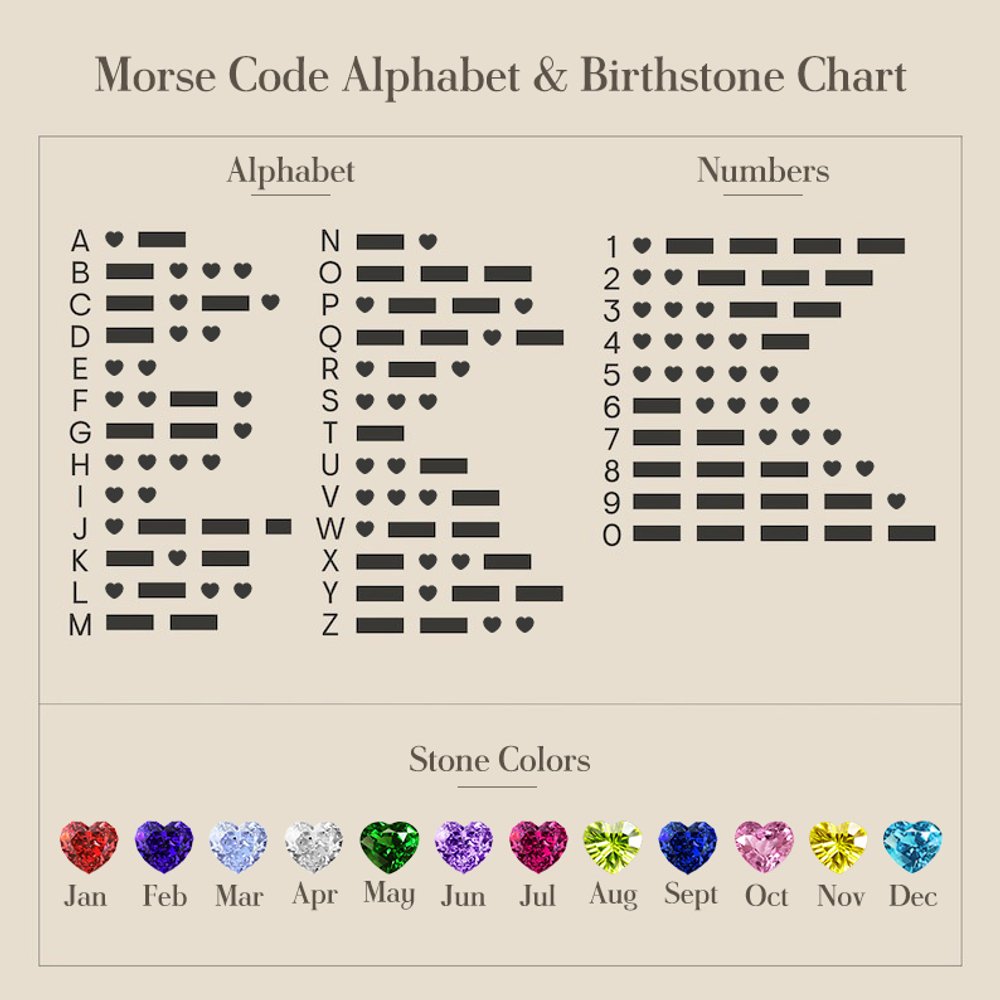 El collar o anillo de piedra de nacimiento de corazón en código Morse es una pieza de joyería verdaderamente única que combina la elegancia con un significado personalizado. Se le permite elegir el color de la piedra de nacimiento y personalizarlo con letras o números en código Morse, lo convierte en un regalo especial y considerado para usted o sus seres queridos.