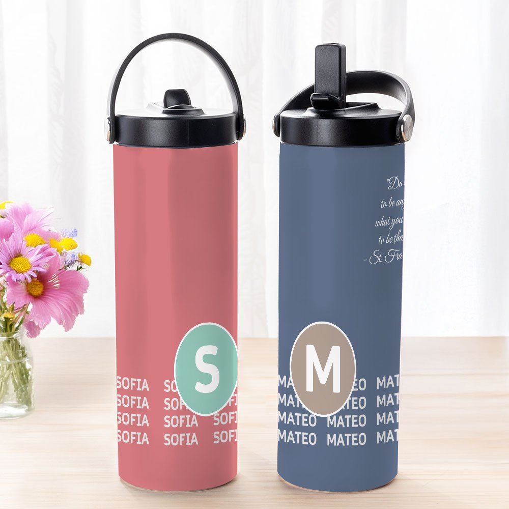 Con una cita inspiradora y una inicial personalizada, este vaso ofrece ánimo constante allá donde vayas. La sección inferior muestra un patrón único de nombres personalizados, creando un diseño exquisito y distintivo.