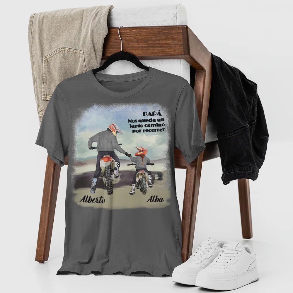 ¡Este es un estupendo regalo para el Día del Padre o de cumpleaños, personaliza esta delicada camiseta con tu nombre y el de tu padre, hará que tu regalo quede genial con el fondo de moto y el eslogan "Papá nos queda un largo camino por recorrero"!