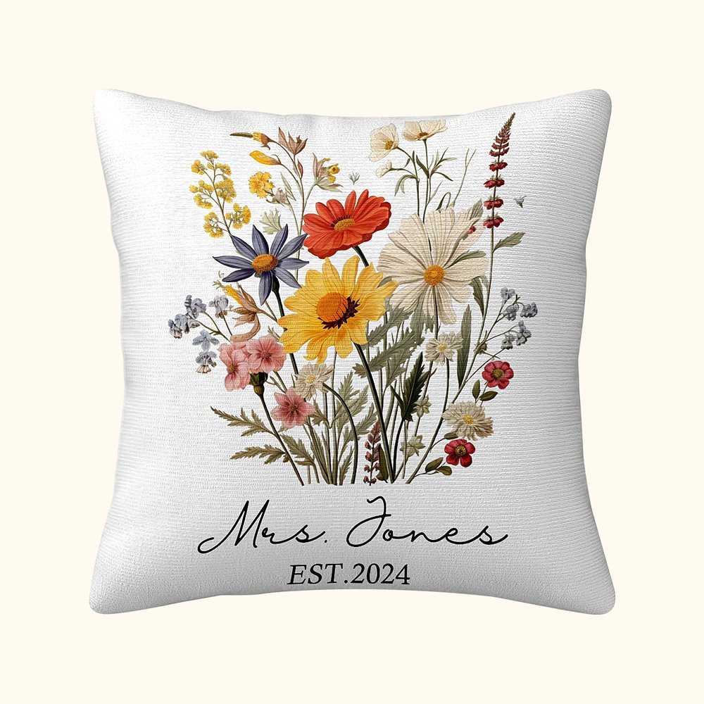Esta encantadora funda de cojín luce un precioso motivo de flores silvestres y pinos, personalizado con los nombres de la pareja y fechas concretas, lo que la convierte en una sentida adición a cualquier hogar.