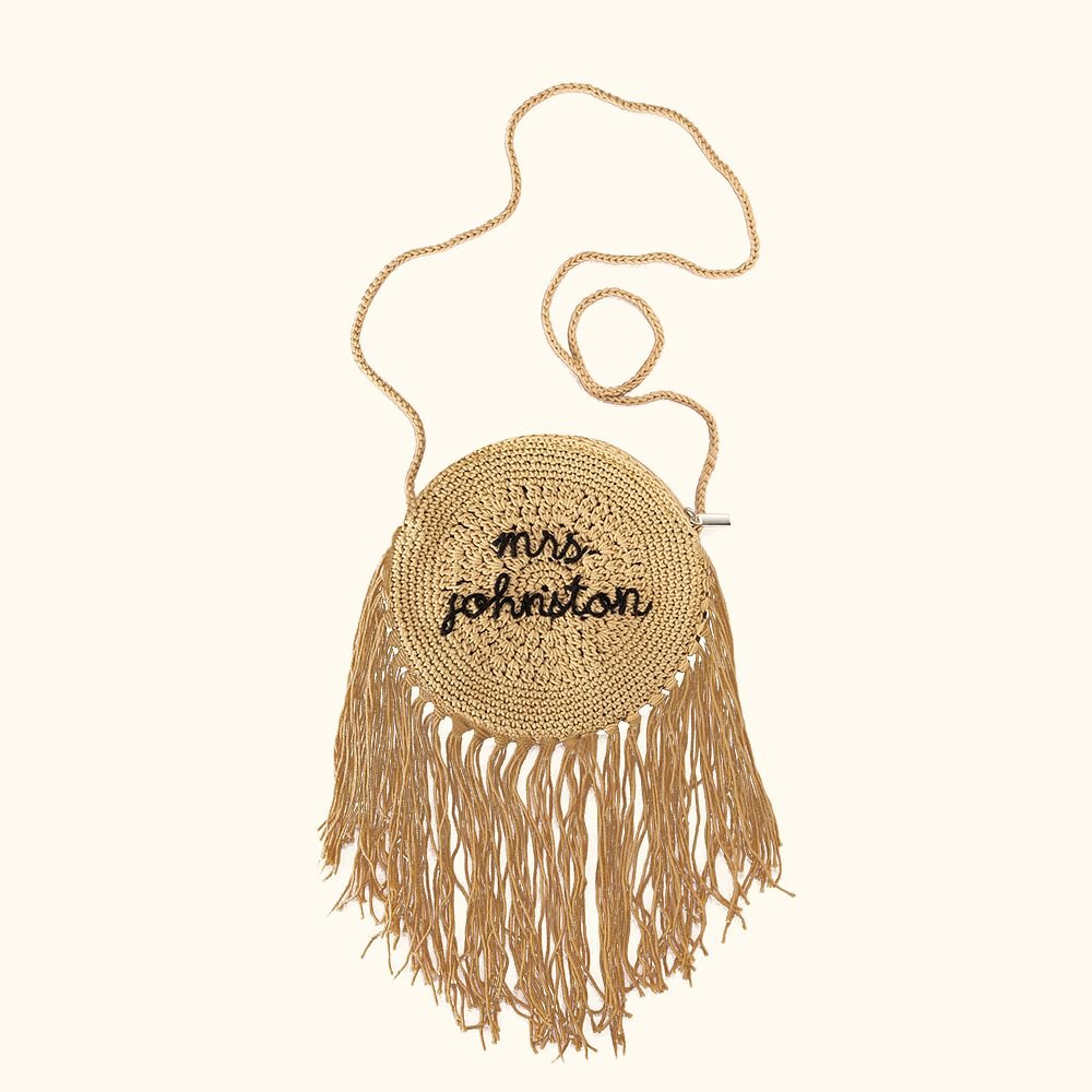Los bolsos de ganchillo personalizados con el futuro apellido de la novia son el regalo boho-chic perfecto para su despedida de soltera o boda. Estos lindos bolsos son ideales para llevar y caben todos sus elementos esenciales básicos. Cada pequeño bolso redondo de ganchillo tiene una correa larga y flecos que cuelgan de la parte inferior. Elige entre nuestro monedero marfil o tostado personalizado con el nombre de tu elección impreso en fieltro.