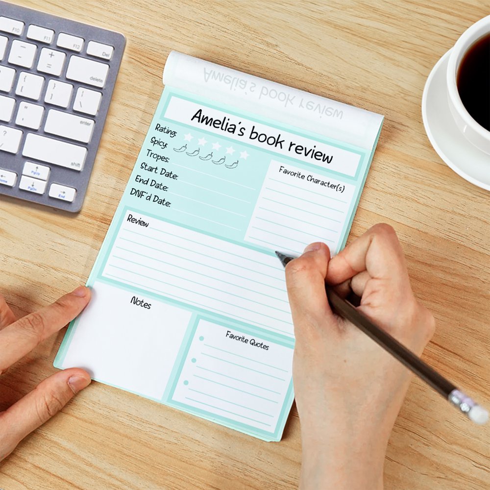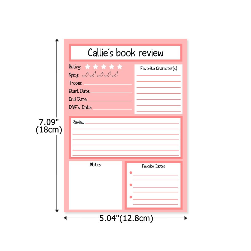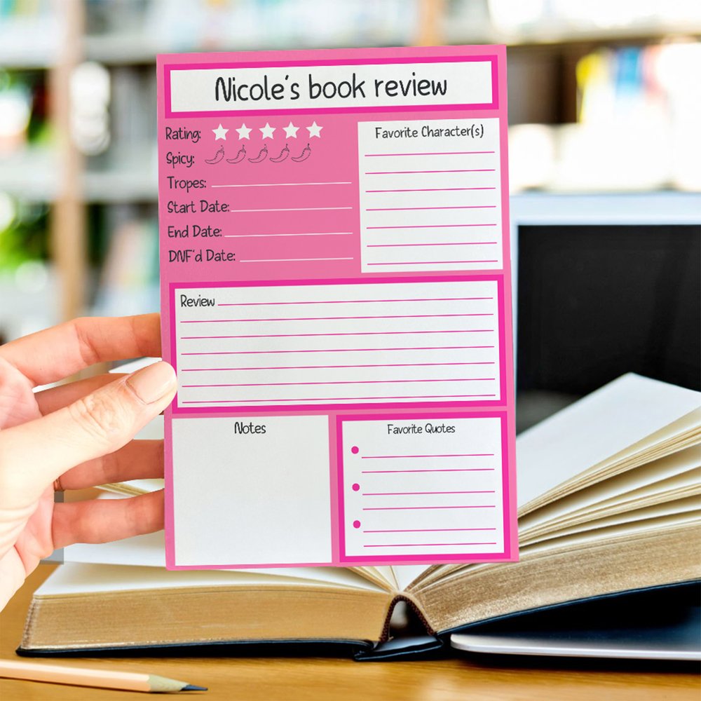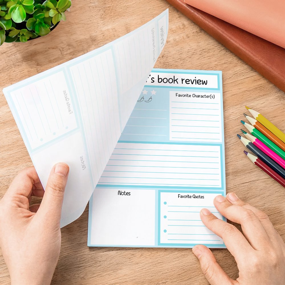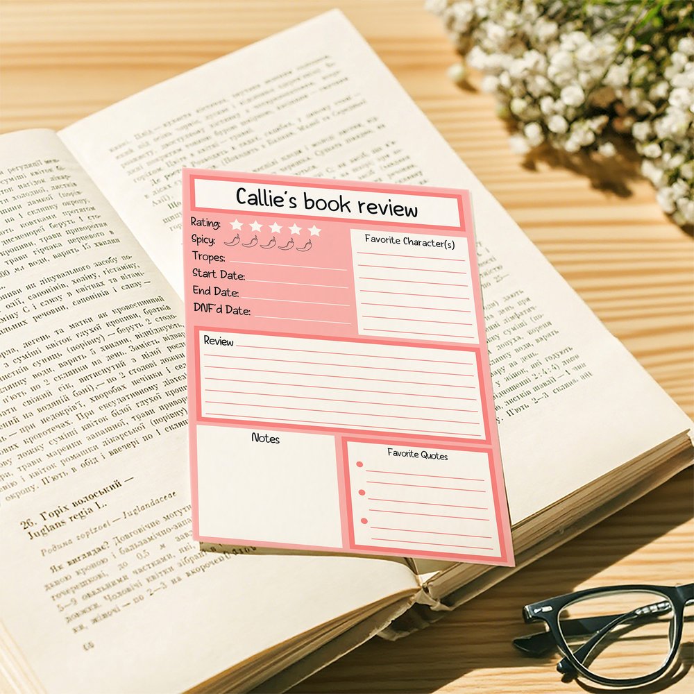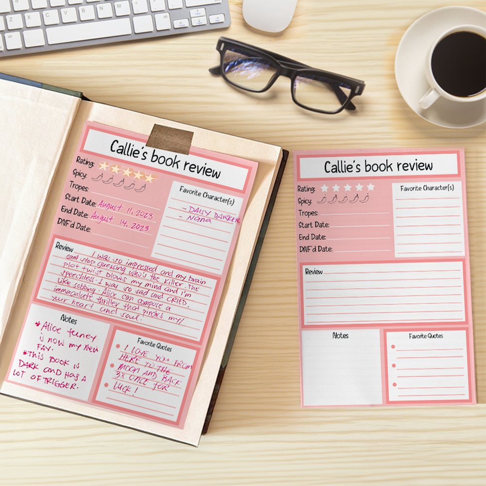 Este bloc de notas para reseñas de libros presenta un diseño sencillo y práctico, centrado en la lectura. Los títulos personalizables permiten que cada bloc de notas tenga un toque personal único. Se adapta a las preferencias de los amantes de los libros, mientras que su estilo minimalista muestra un compromiso con la lectura, convirtiéndolo en un compañero de lectura práctico y personal.