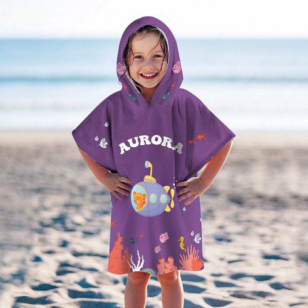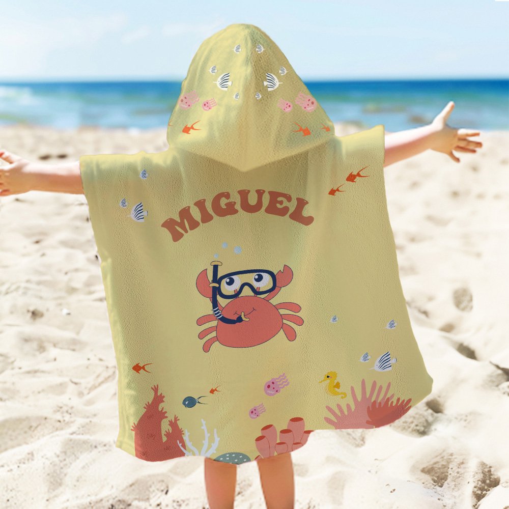 Esta toalla de playa con capucha está impresa con lindos patrones de animales de buceo en forma de dibujos animados, como conejos, osos, perros, pandas, etc., y está decorada con diversos patrones de vida marina, como peces pequeños y caballitos de mar, como si llevara a los niños a un maravilloso mundo submarino. El diseño con capucha no solo agrega practicidad, sino que también hace que la forma general de la toalla de playa sea más adorable. La toalla de playa también permite la personalización de nombres, lo que la hace aún más exclusiva.