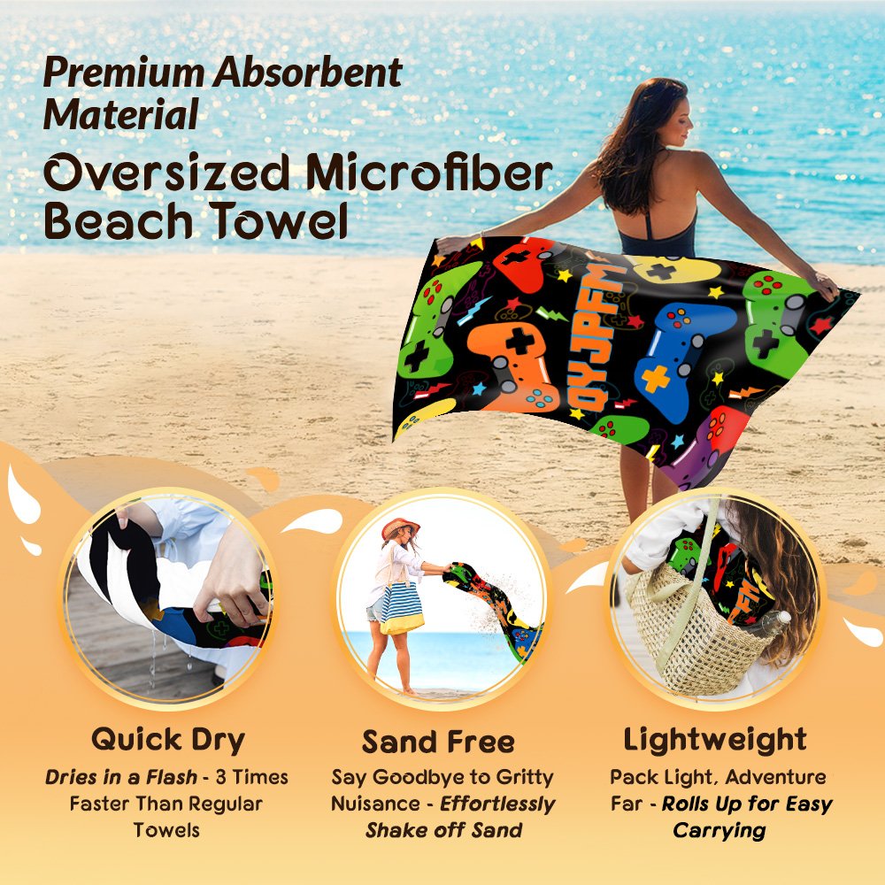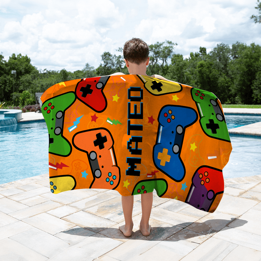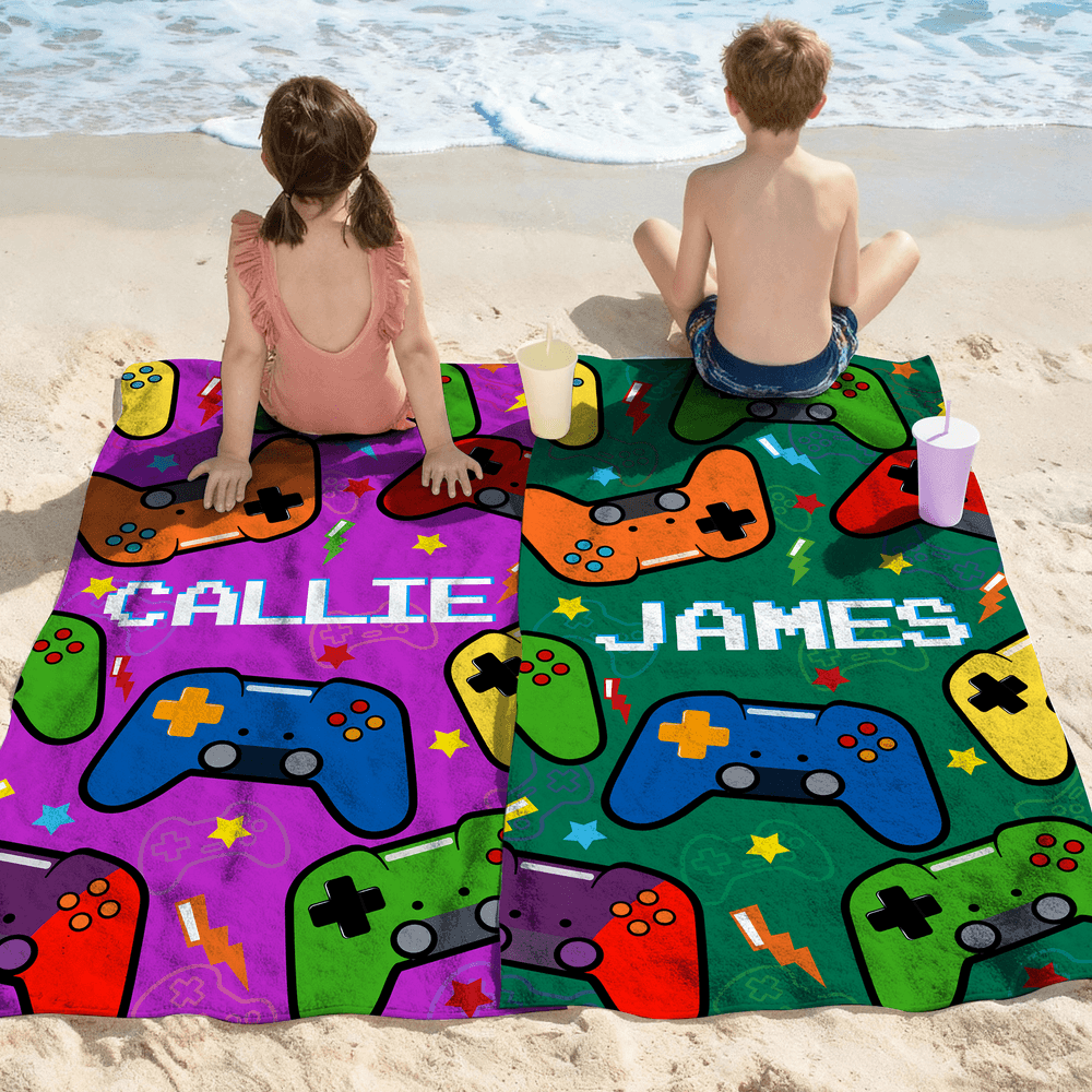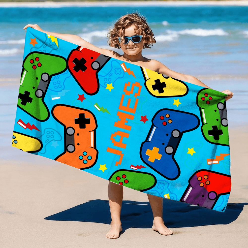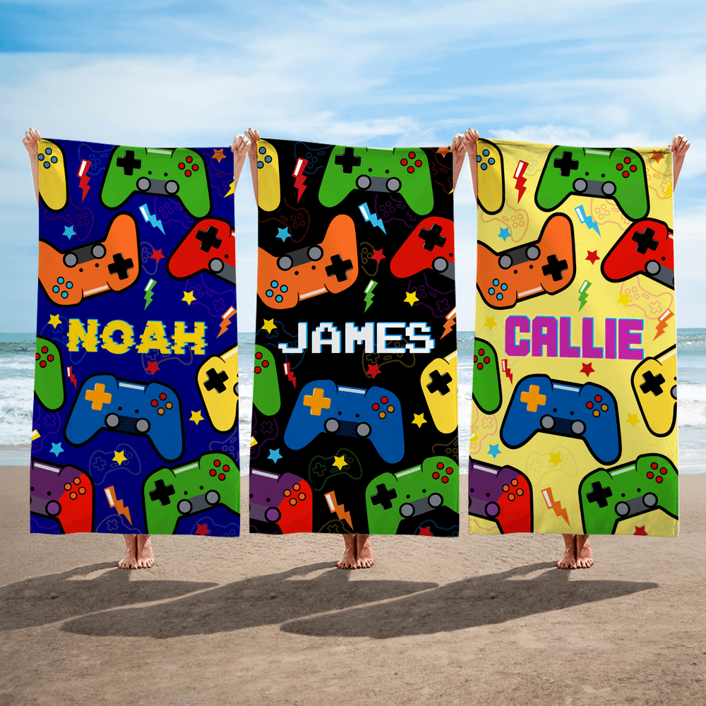 Centrada en torno a vibrantes dibujos de mandos de juegos acentuados con rayos y estrellas, esta toalla ofrece 17 colores de fondo personalizables. Combinada con un bordado personalizado con el nombre, va más allá de la ropa de playa normal y se convierte en una pieza única y expresiva.