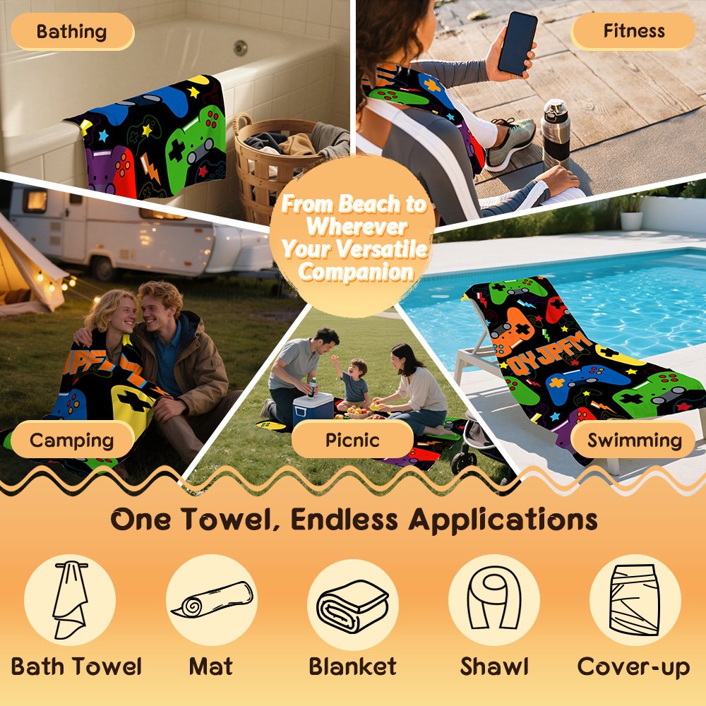 Su funcionalidad básica brilla en las vacaciones en la playa y en las salidas a la piscina, ya que sirve como toalla de secado rápido mientras sus modernos estampados marcan estilo en la arena. En casa, sirve como toalla de baño o manta acogedora para un confort suave. También realza las reuniones de juego temáticas o los picnics al aire libre como acento decorativo, alineándose con las aficiones para infundir diversión al tiempo libre.