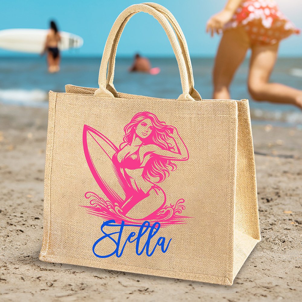 El diseño de la bolsa utiliza una vibrante chica surfera como elemento visual principal, con motivos como olas y cocoteros, como si el sol brillante y las olas embravecidas de la costa tropical estuvieran congelados en un pequeño espacio. Se puede personalizar libremente con el nombre, haciendo de cada bolsa un símbolo único de personalidad.