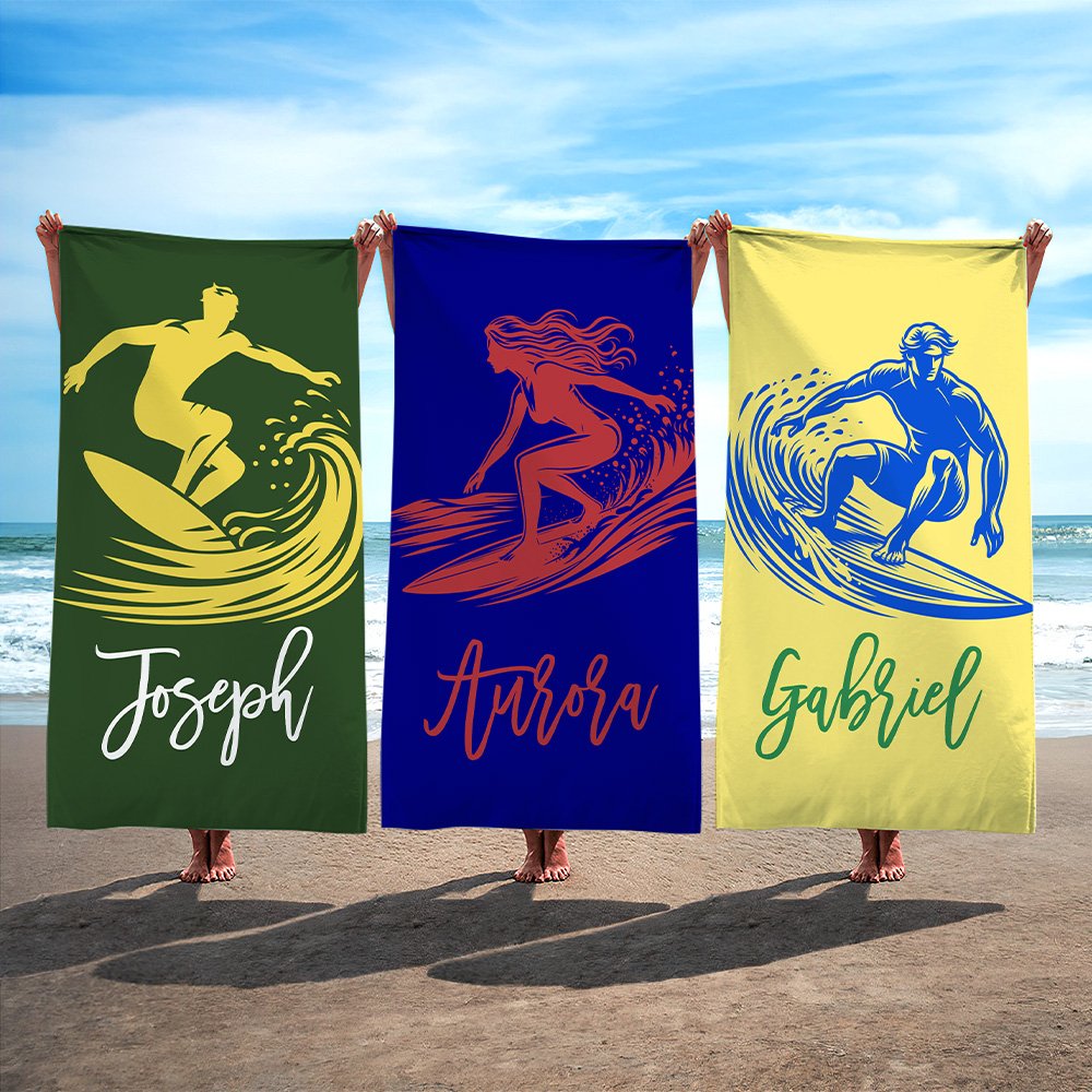 El diseño de esta toalla de playa está lleno de vitalidad y dinamismo, y capta a la perfección la esencia del surf. El estampado incorpora elementos como tablas de surf, olas y siluetas de personas, con 22 colores de fondo brillantes opcionales, que muestran el poder y la belleza del océano. También puede personalizar su nombre en la toalla de playa para que cada toalla de playa sea única.
