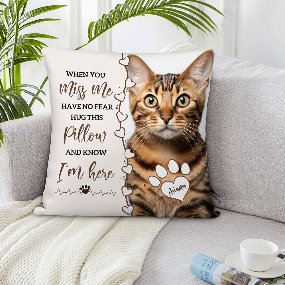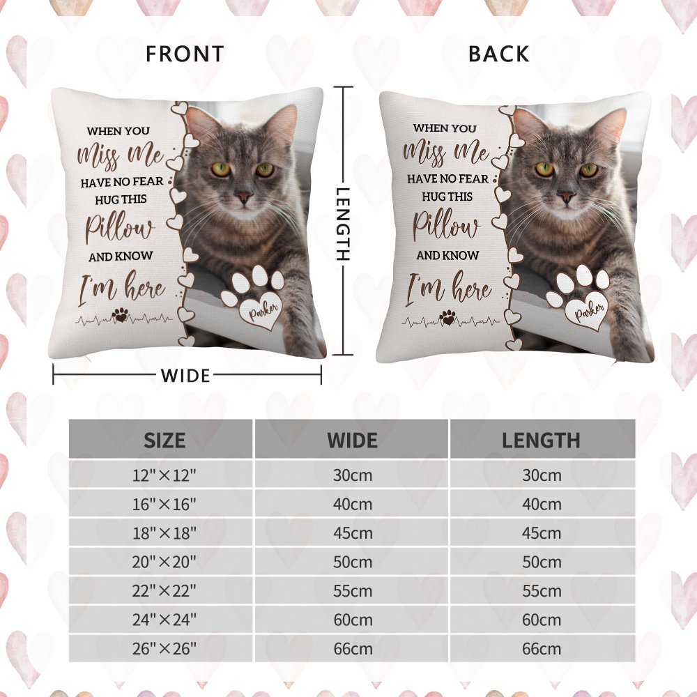 El diseño general de la almohada se divide en dos partes, el lado izquierdo es "Cuando me extrañes, no tengas miedo, abraza esta almohada y sabe que estoy aquí" texto cálido de corazón, y la parte inferior con una pata de mascota y elementos de ECG, hacen que la almohada sea más íntima. En el lado derecho hay un diseño personalizado, puede personalizar la almohada con la foto de su mascota, añadir el nombre de su mascota y crear un regalo único.