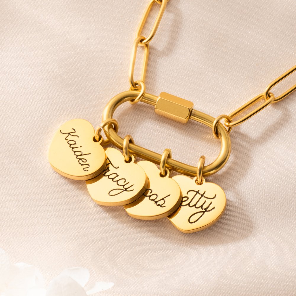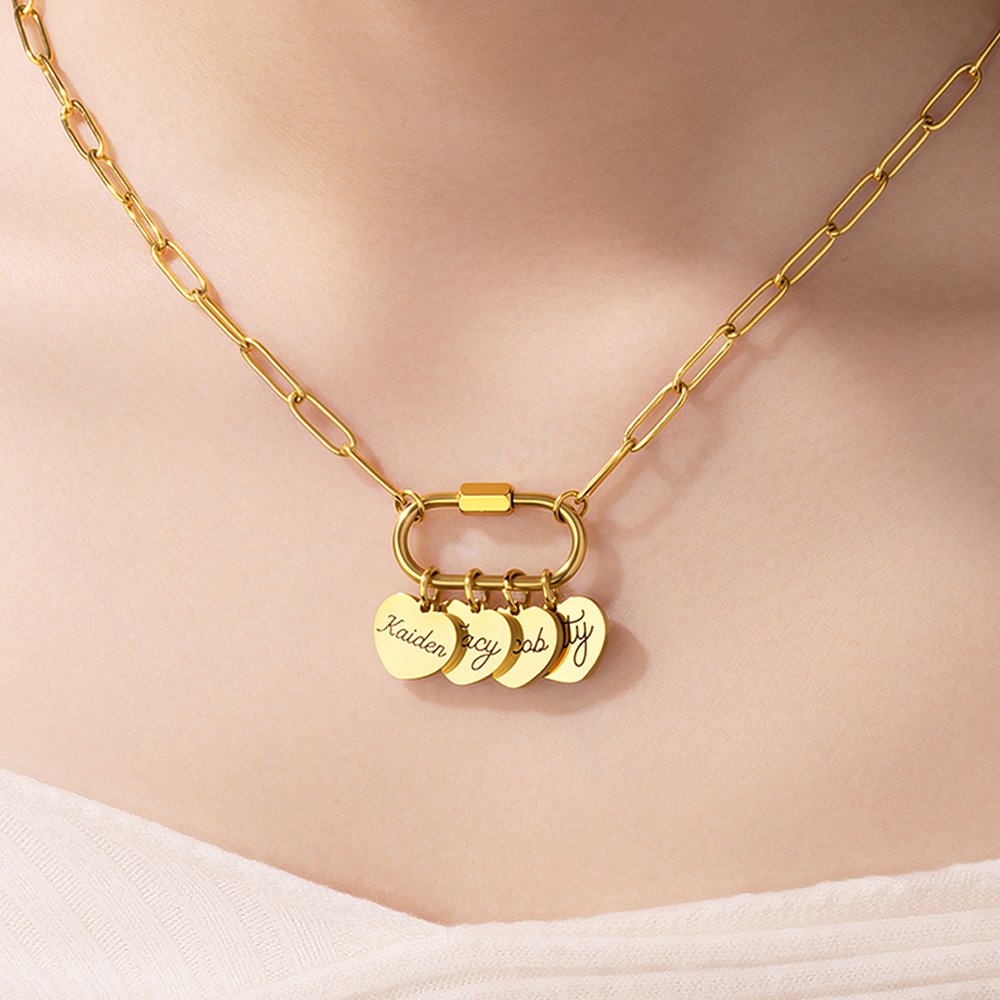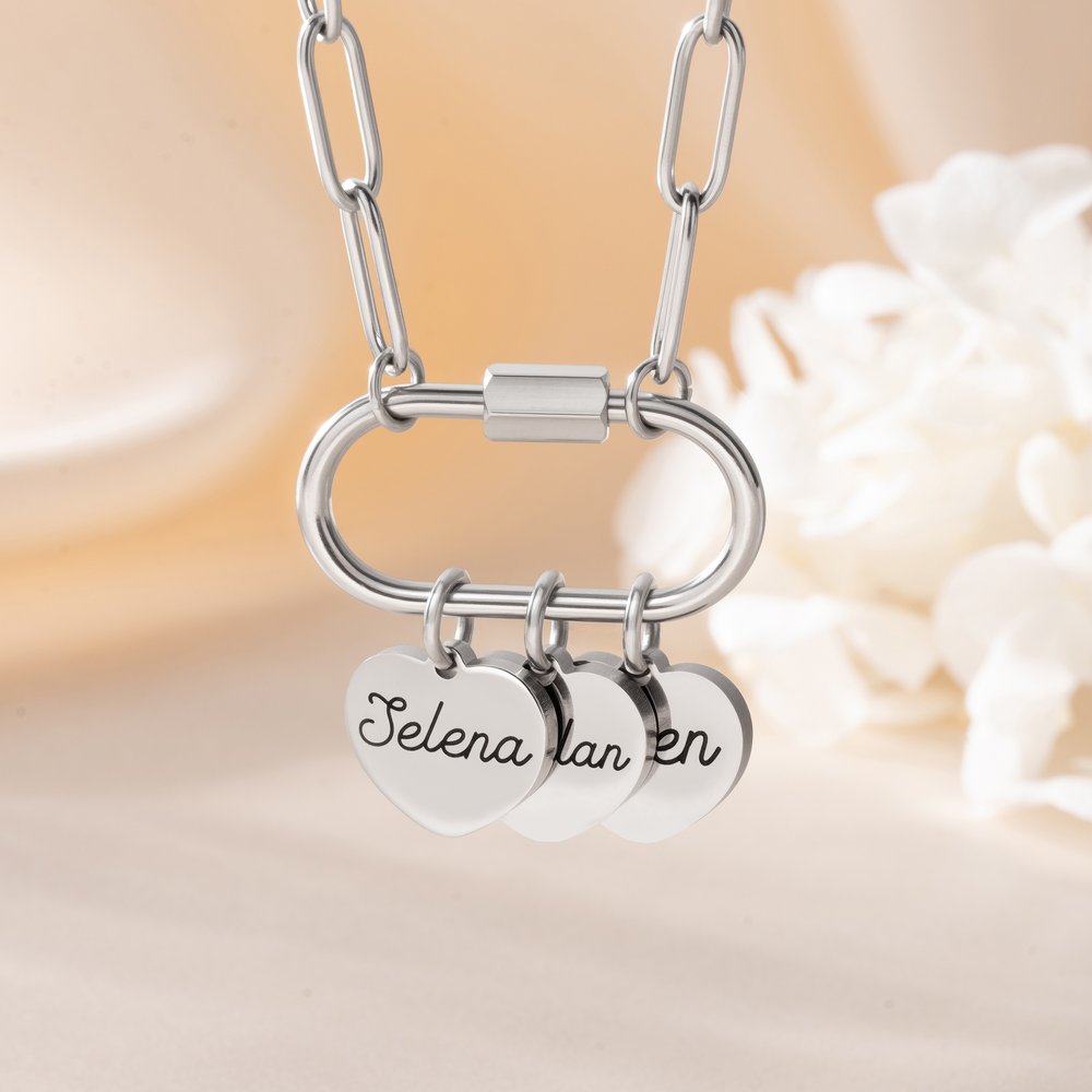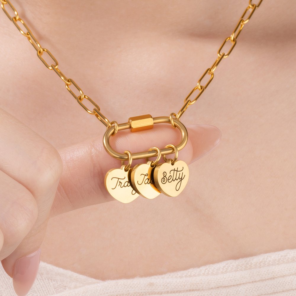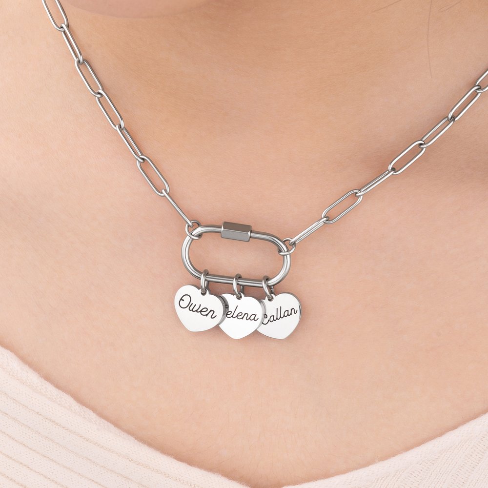 Este collar con nombre personalizado tiene un diseño moderno y elegante con una cadena atemporal tipo clip, disponible en dos acabados pulidos para un look refinado de diario. Su característica más destacada son los colgantes de corazón totalmente personalizables, en los que puedes grabar de 1 a 10 delicadas etiquetas de corazón con cualquier nombre en letra cursiva. Cada corazón grabado cuelga perfectamente del sujetapapeles, creando un diseño en capas que es único para ti y tus seres queridos.