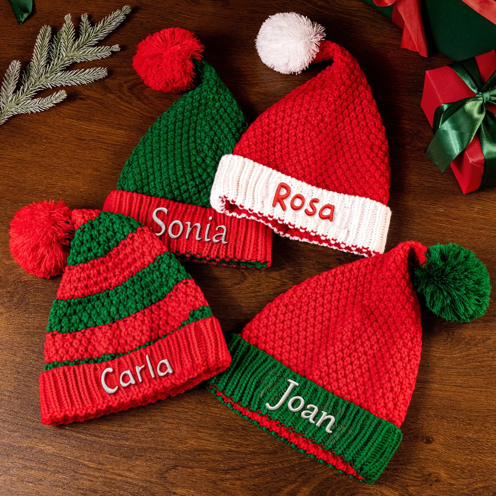 Eleva tu estilo navideño con nuestros gorros de punto festivos, disponibles en cuatro diseños navideños clásicos. Cada gorro puede personalizarse con un nombre, creando un accesorio único que combina el encanto tradicional de las fiestas con un significado personal.