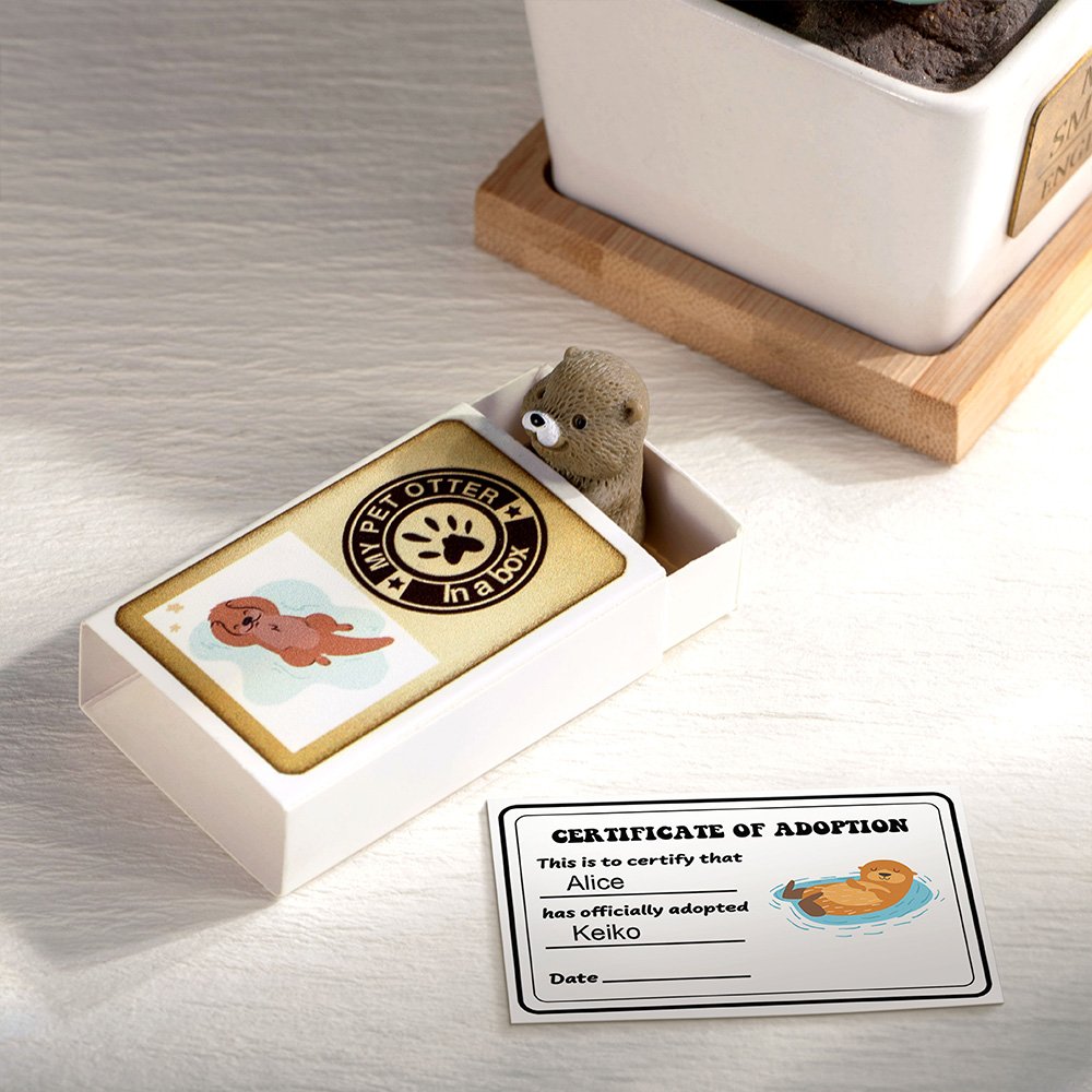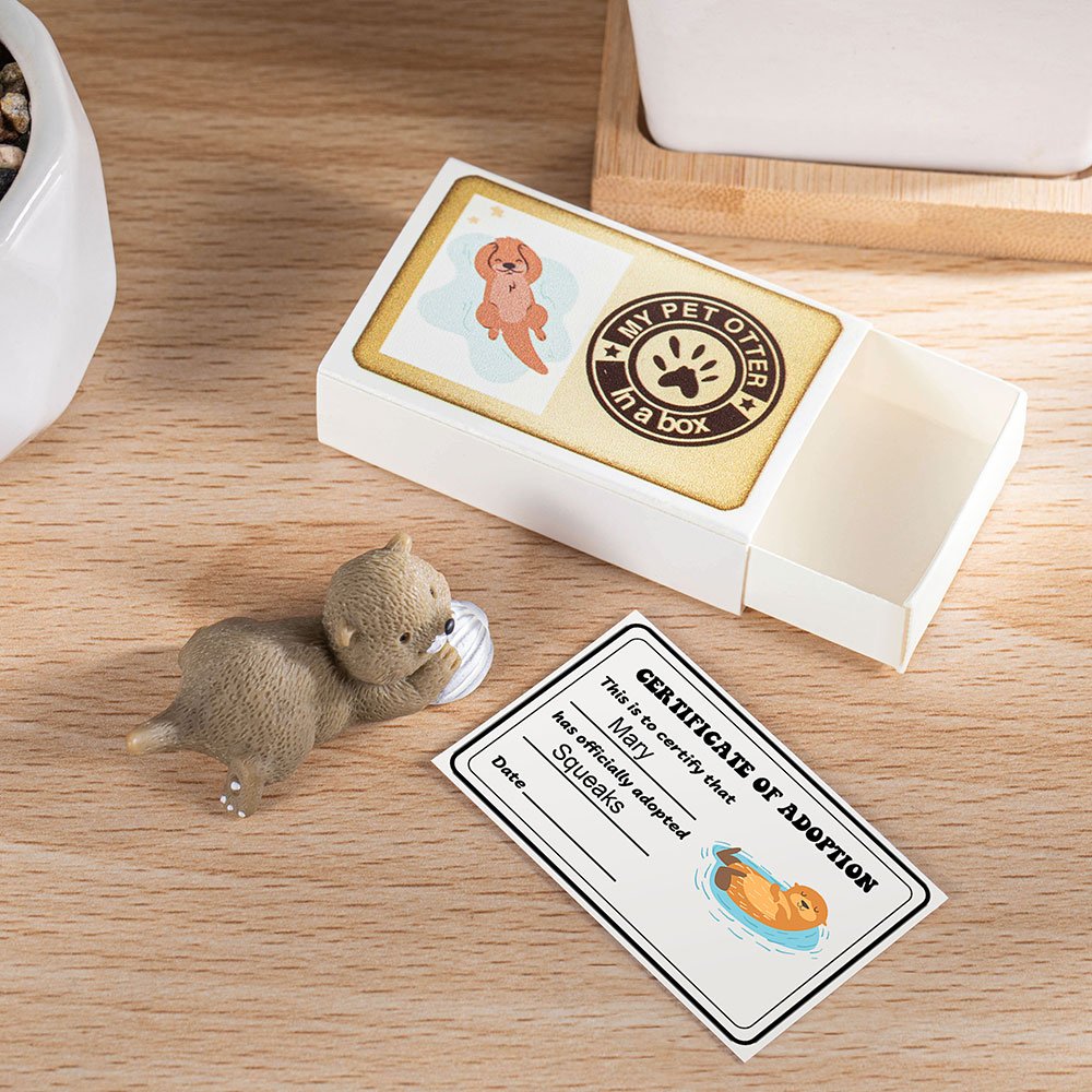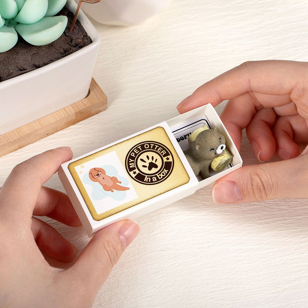 El juego de palabras "Mi nutria mascota en una caja" de nuestras cajas de cerillas, combinado con el minicertificado de adopción, añade interés y singularidad al producto. Con su pose serena y lánguida, nuestra mini figurita de nutria aporta una profunda sensación de alivio a toda persona especial. Estas figuritas vienen en una elegante caja estilo caja de cerillas, como si las mascotas "salieran" de la caja. Hay cuatro tipos de figuritas de nutria, cada una de las cuales ha sido cuidadosamente elaborada y detallada para enamorar a la gente.