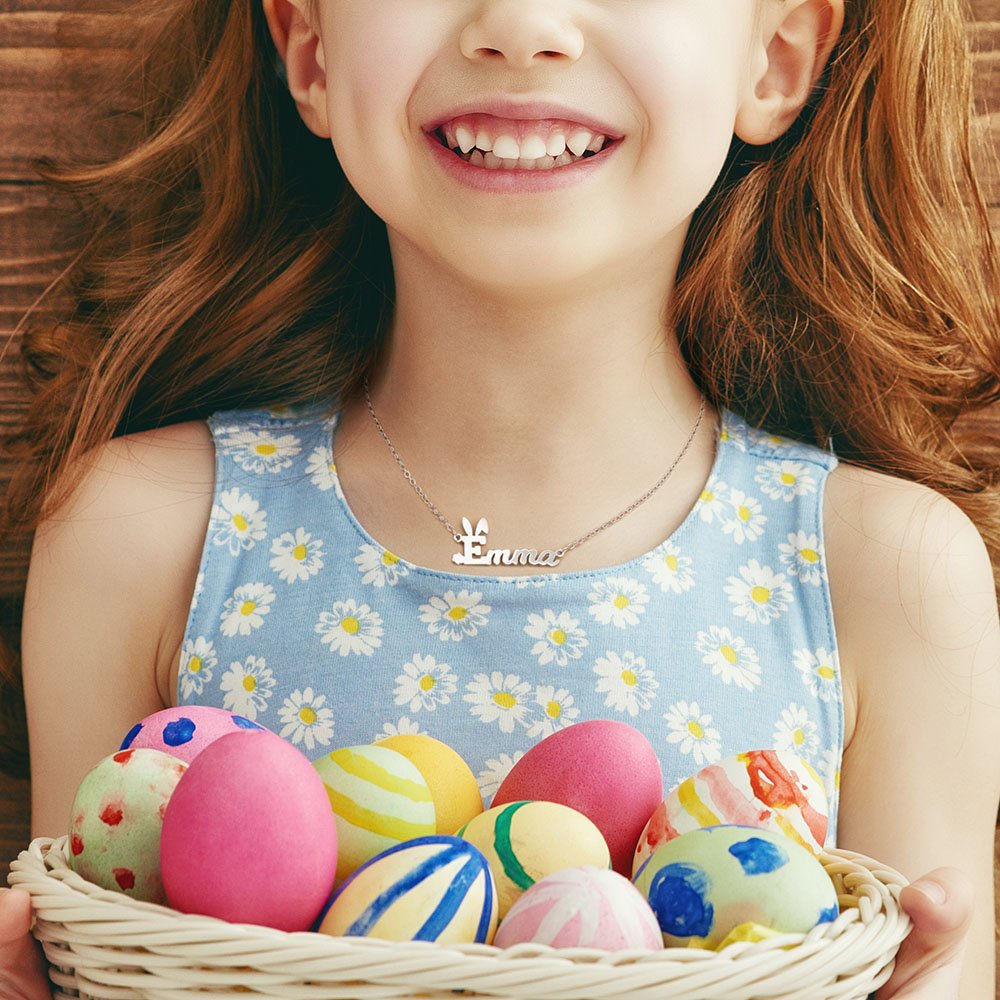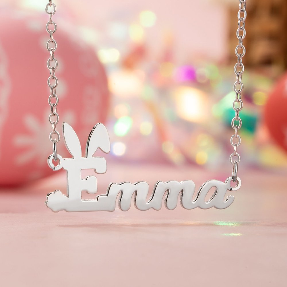 Un collar único diseñado con el elemento del conejo de Pascua combinado con la personalización del nombre. Celebra la Pascua con un collar con nombre de Pascua para destacar entre los demás en la fiesta. Son de alta calidad, delicados y muy bonitos: el collar delicado perfecto para llevar a diario. -Diseño encantador: Estos personalizados lindo conejito conejo collares vienen en su elección de oro, oro rosa y plata de color con la forma de la oreja de conejo por encima del nombre colgante. -El mejor regalo: este collar de conejito de Pascua con nombre único es un bonito regalo para su hijo como recompensa por su buen comportamiento. También, es el regalo perfecto para usted mismo, amigos o alguien especial.