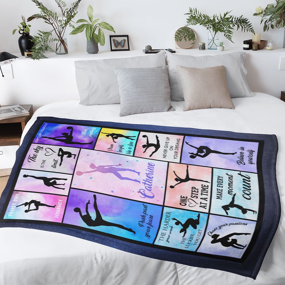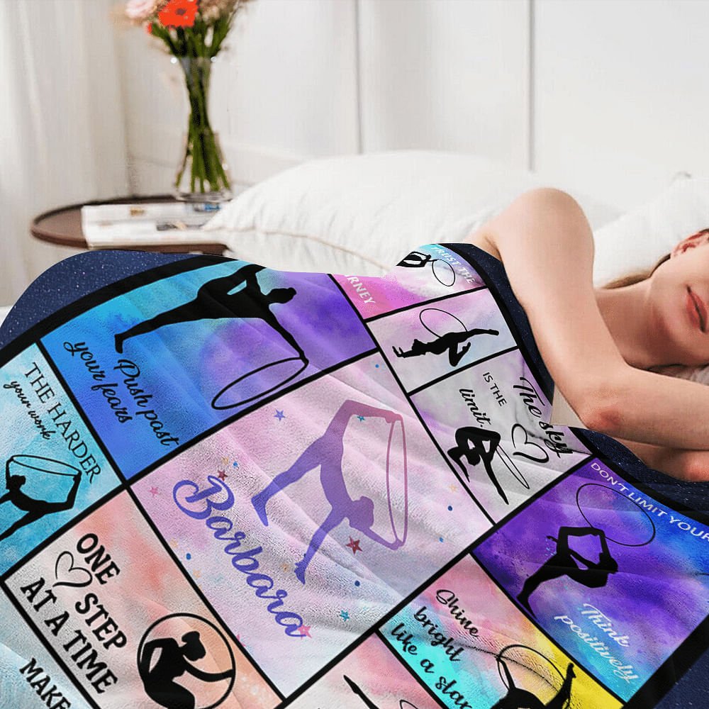 Esta manta de gimnasia rítmica se puede personalizar con varias poses de gimnasia, como aros, pelotas, mazas, cintas, ejercicios de suelo y un nombre. Esto la convierte en un regalo único y significativo que celebra su pasión por el deporte.