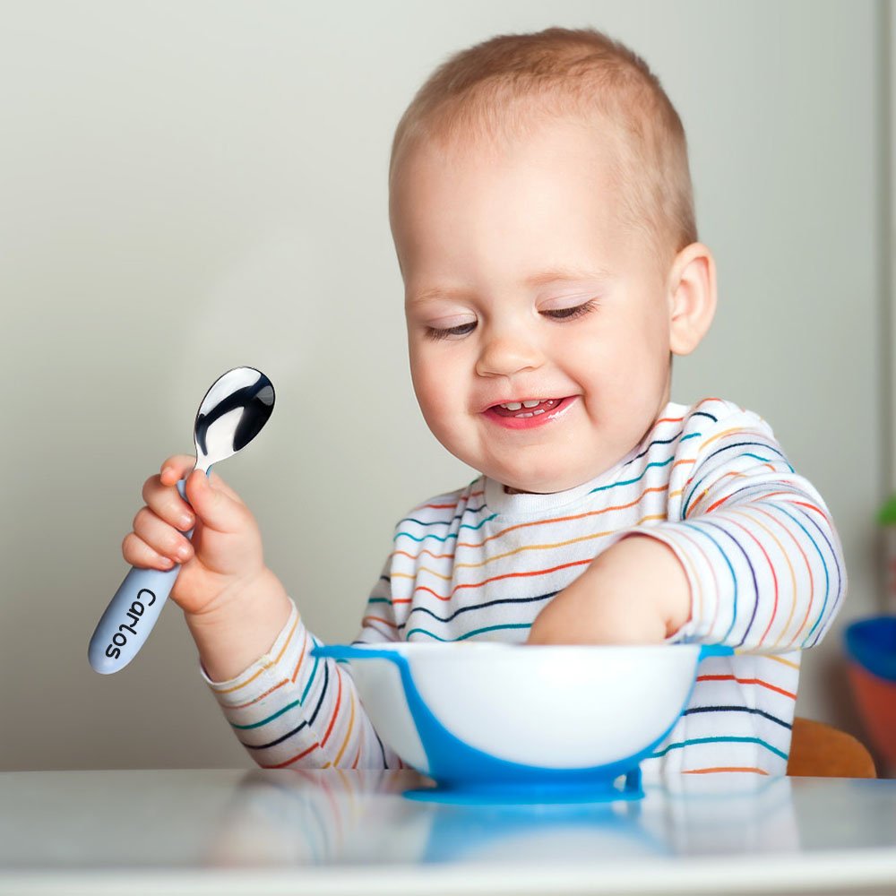 Este set de cubiertos viene en tres colores refrescantes: rosa, verde y azul, añadiendo diversión al momento de la comida de los niños. El nombre del niño se puede imprimir de manera exquisita en los mangos de la cuchara y el tenedor, haciendo que cada comida sea exclusiva y llena de ritual.