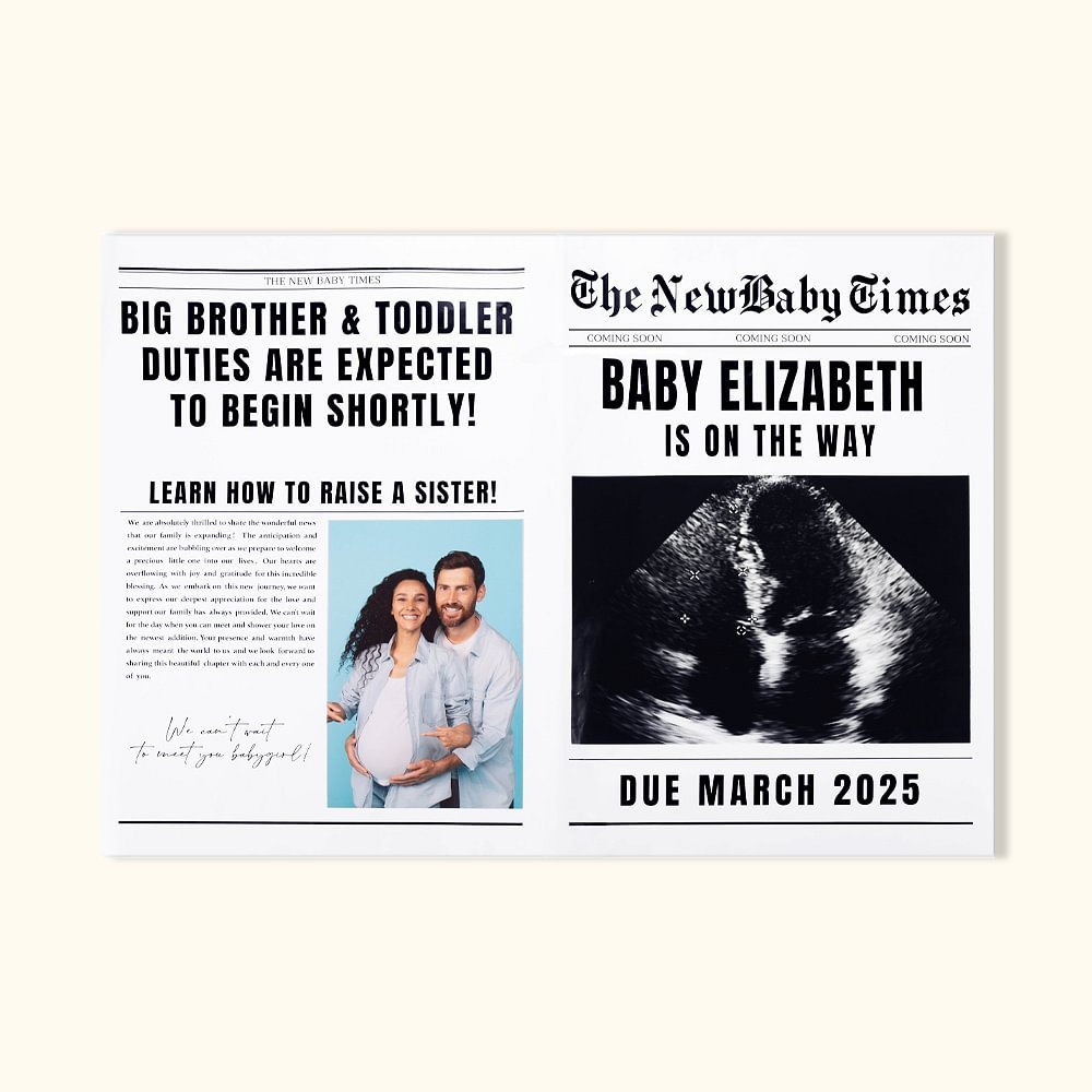 Este periódico personalizado de anuncio de recién nacido presenta un diseño creativo y llamativo. Imita el estilo de un periódico real con titulares llamativos y un diseño clásico. La combinación de texto y foto hace que destaque, permitiéndole compartir la emocionante noticia de la próxima llegada de su bebé de forma única y memorable.