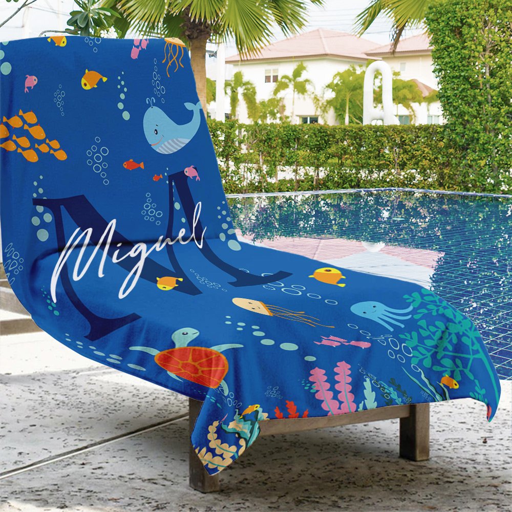Imagina la cara de tus hijos iluminándose cuando vean sus iniciales o sus nombres bellamente diseñados. La combinación con el diseño del mundo marino convierte esta toalla en un tesoro único. Esta personalización añade un elemento especial y sincero que la convierte en un recuerdo inolvidable.