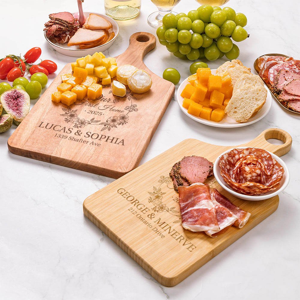 Esta tabla de cortar de doble cara es el regalo perfecto para celebrar un nuevo hogar. Presenta un bonito motivo de corona grabado con "Nuestro primer hogar" y emparejado con tu nombre y el de tus seres queridos y el año, mostrando un rasgo personalizado. Cada tabla de cortar es única y simboliza el comienzo de una nueva vida para usted y su familia.